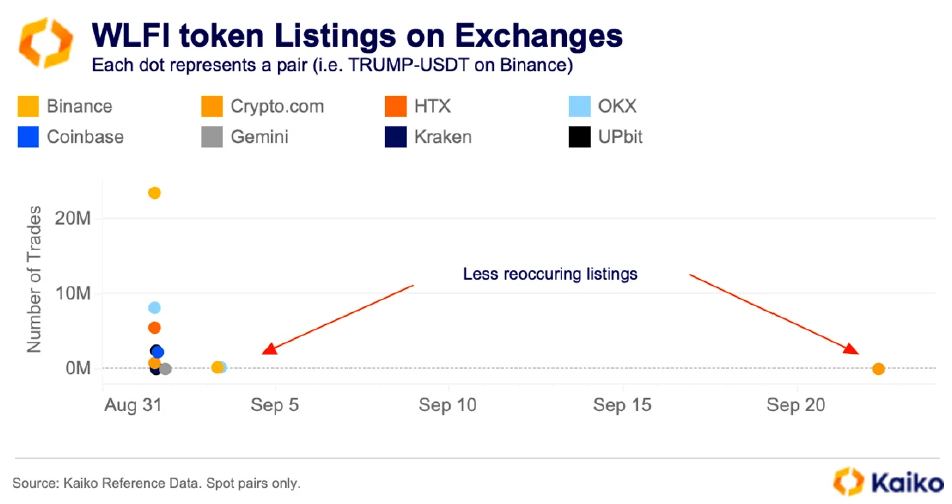 트럼프 밈코인과 비교할 때, WLFI 토큰에 대한 수요는 훨씬 더 일관성이 없었다. 주요 암호화폐 거래소의 신규 거래 쌍 상장은 급격히 감소했으며, 지난 두 달 동안 단 하나의 신규 거래 쌍만 추가되었다.