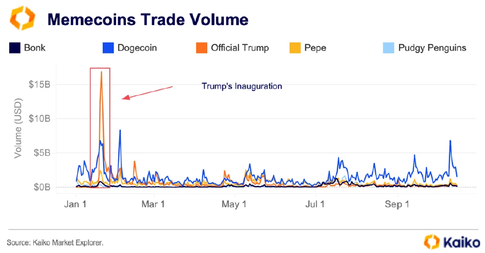 트럼프 밈코인은 출시 후 급등했으며, 코인베이스(Coinbase)를 포함한 주요 중앙화 거래소들이 상장 계획을 발표하면서 첫 주말 동안 가격이 72달러까지 올랐다. 트럼프 토큰(Trump Token)의 미국 달러 거래량도 트럼프 대통령의 두 번째 취임식 당일 급증했다. 그러나 급등은 오래가지 않았다. 거래량은 취임식 기간 동안 최고치인 150억 달러 이상에서 현재 10억 달러 미만으로 감소했으며, 이는 자산의 고도로 투기적이고 이벤트 중심적인 특성을 부각시킨다.