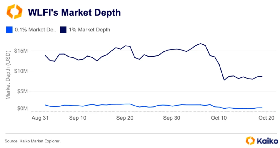 충분한 시장 조성 활동의 부족은 10월 10일 폭락 이후 깊이 하락으로 강조된다. 매도 물량이 쏟아지는 동안 거래량이 급증하고 유동성이 고갈되었는데, 이는 대부분의 자산에서 나타난 현상이었다. 그러나 WLFI 깊이는 이전 수준 이하로 유지되어, 시장 조성자와 거래자들이 자산으로 서둘러 돌아오지 않고 있음을 시사한다.