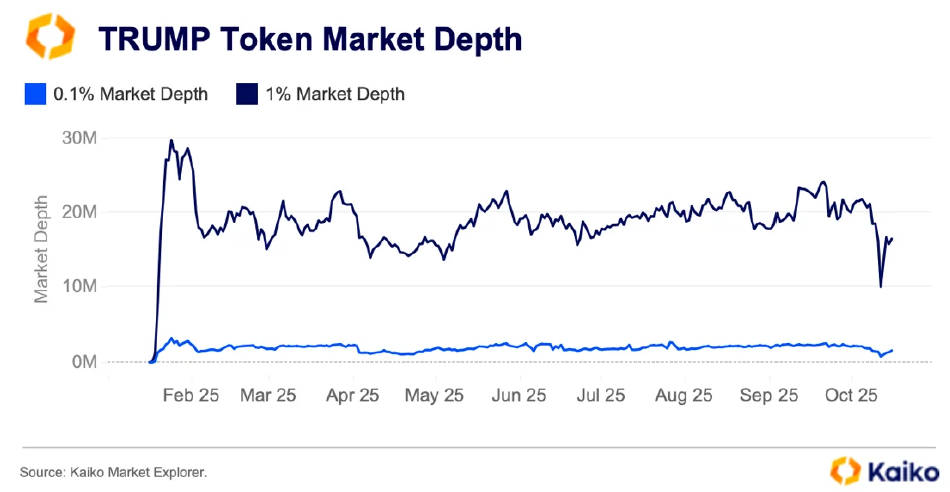 1년이 지난 지금, 트럼프 가족 토큰은 일시적인 과대 광고와 지속적으로 얇은 유동성으로 정의된다. 밈코인은 초기에 내러티브를 주도했지만, 거래량과 가격은 빠르게 정상화되었으며, 얕은 깊이와 후발 매수자들에게 하락을 남겼다. 유동성은 스트레스 이벤트 주변에서 반복적으로 얇아졌으며, 이는 감정 중심 거래를 강조한다.