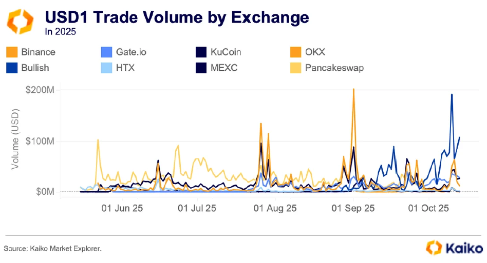 트럼프 암호화폐 포트폴리오에서 개선된 활동을 보이는 유일한 토큰은 USD1 스테이블코인이다. 5월과 9월 사이에 거래량은 팬케이크스왑(PancakeSwap)에 집중되었다. 8월 말 이후 불리시(Bullish) 상장에 따라 거래량이 크게 증가했다.