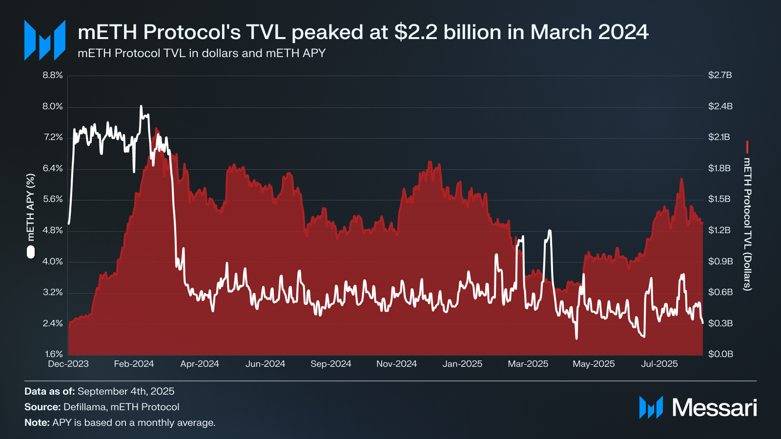 2023년 12월 공개 출시 후, mETH 프로토콜의 총 TVL은 2024년 3월 21억 9,000만 달러로 정점을 찍었다. 2025년 9월 기준 TVL은 12억 7,000만 달러에 머물러 있지만, mETH 프로토콜은 시간이 지나면서 대규모 인프라로서 신뢰를 구축하는 데 의미 있는 진전을 이루었다.