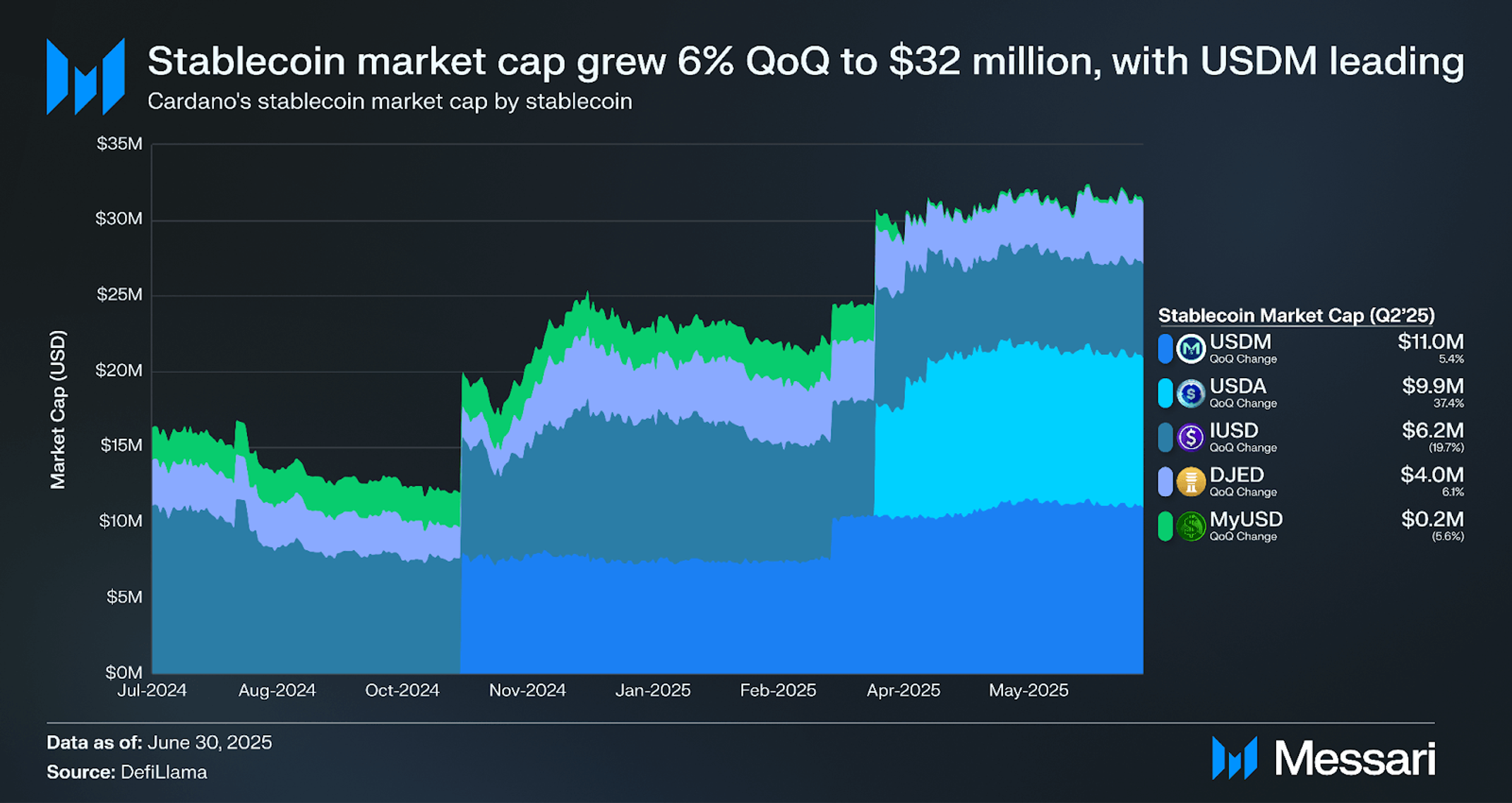 카르다노(Cardano)의 평균 일일 DEX 거래량은 2분기에 전분기 대비 38% 감소한 360만 달러를 기록했으며, 스테이블코인 공급량은 전분기 대비 6% 증가해 활발한 거래에서 스테이블코인 보유로 사용자 행동이 변화했다.