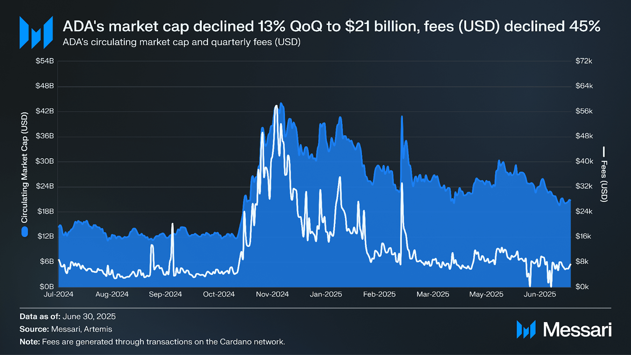 카르다노의 평균 거래 수수료(USD)는 12% 하락하여 0.25 달러를 기록한 반면, 평균 거래 수수료(ADA)는 전분기 대비 9% 상승하여 0.38을 기록했으며, 이는 네트워크 사용 비용에 대한 ADA의 가격 변동성의 영향을 부각시킨다.