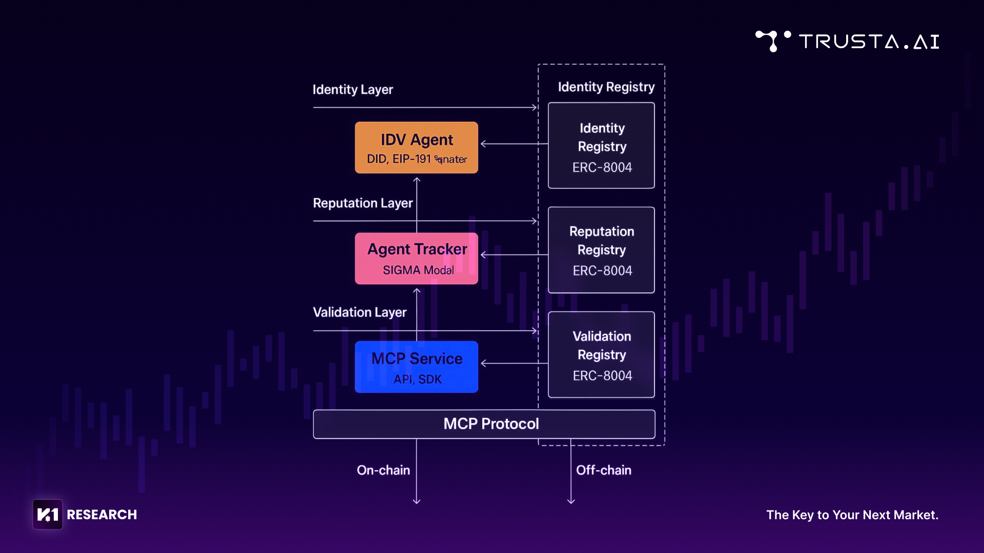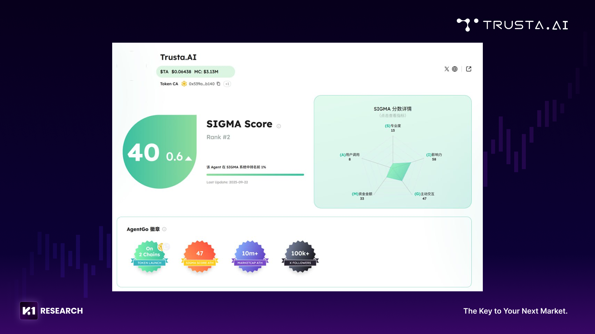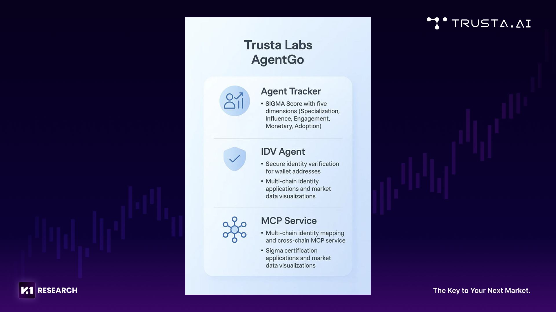 응용 계층에서는 Trusta AI의 AgentGo가 이러한 표준을 현실로 확장하고 있다. 장기간 탈중앙화 신원 및 평판 연구에 집중한 Trusta AI는 ERC-8004의 “신원–평판–검증” 논리를 실제 운영 가능한 폐쇄 루프 구조로 구현하였다. IDV Agent를 통해 신원을 확인하고, SIGMA 점수로 평판을 정량화하며, MCP 서비스를 활용해 에이전트 간 신뢰 흐름을 실현함으로써, 기존 표준과의 호환성을 유지하는 동시에 “프로토콜에서 응용으로”의 공백을 메우고 있다.