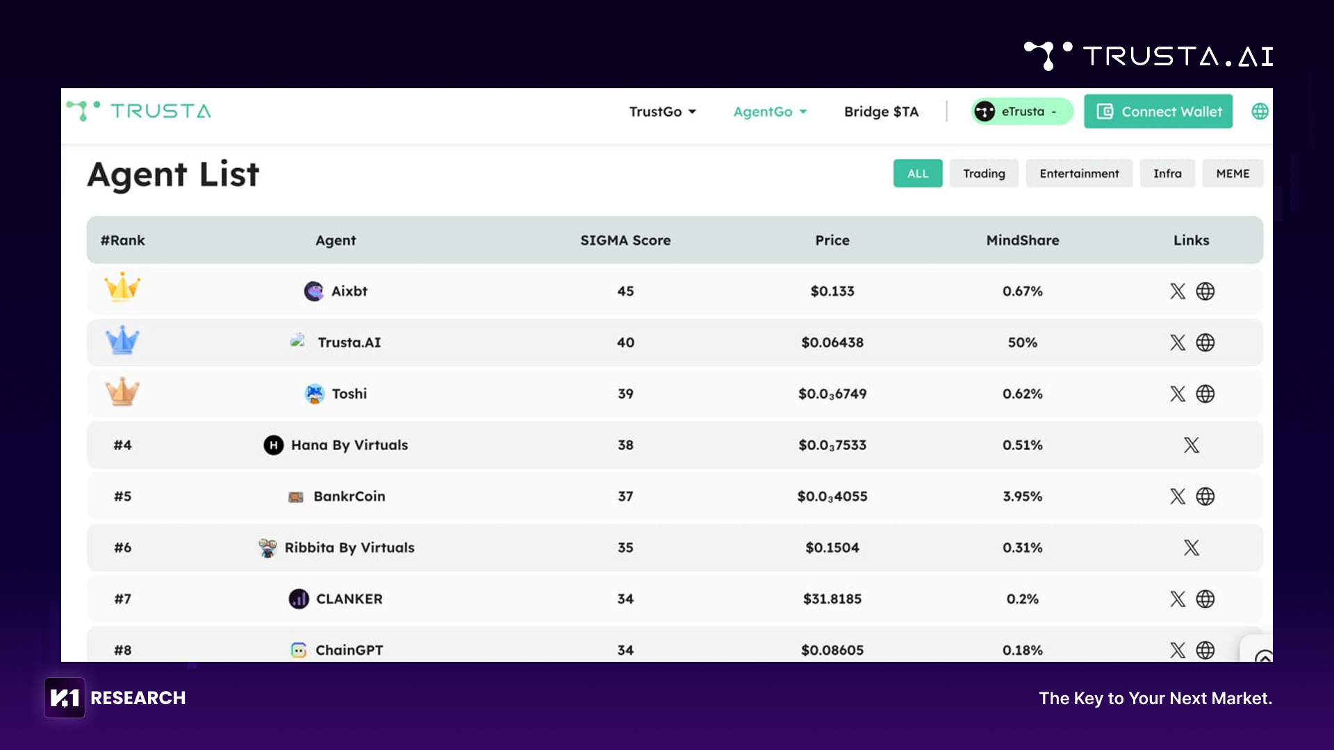 ERC-8004 출시 이전, Trusta AI는 Virtuals, ElisaOS, Swarms 등 AI 생태계의 모든 에이전트를 완전 색인했다. AgentGo-Tracker를 통해 사용자는 특정 에이전트의 SIGMA 신뢰 점수를 쉽게 조회할 수 있다.