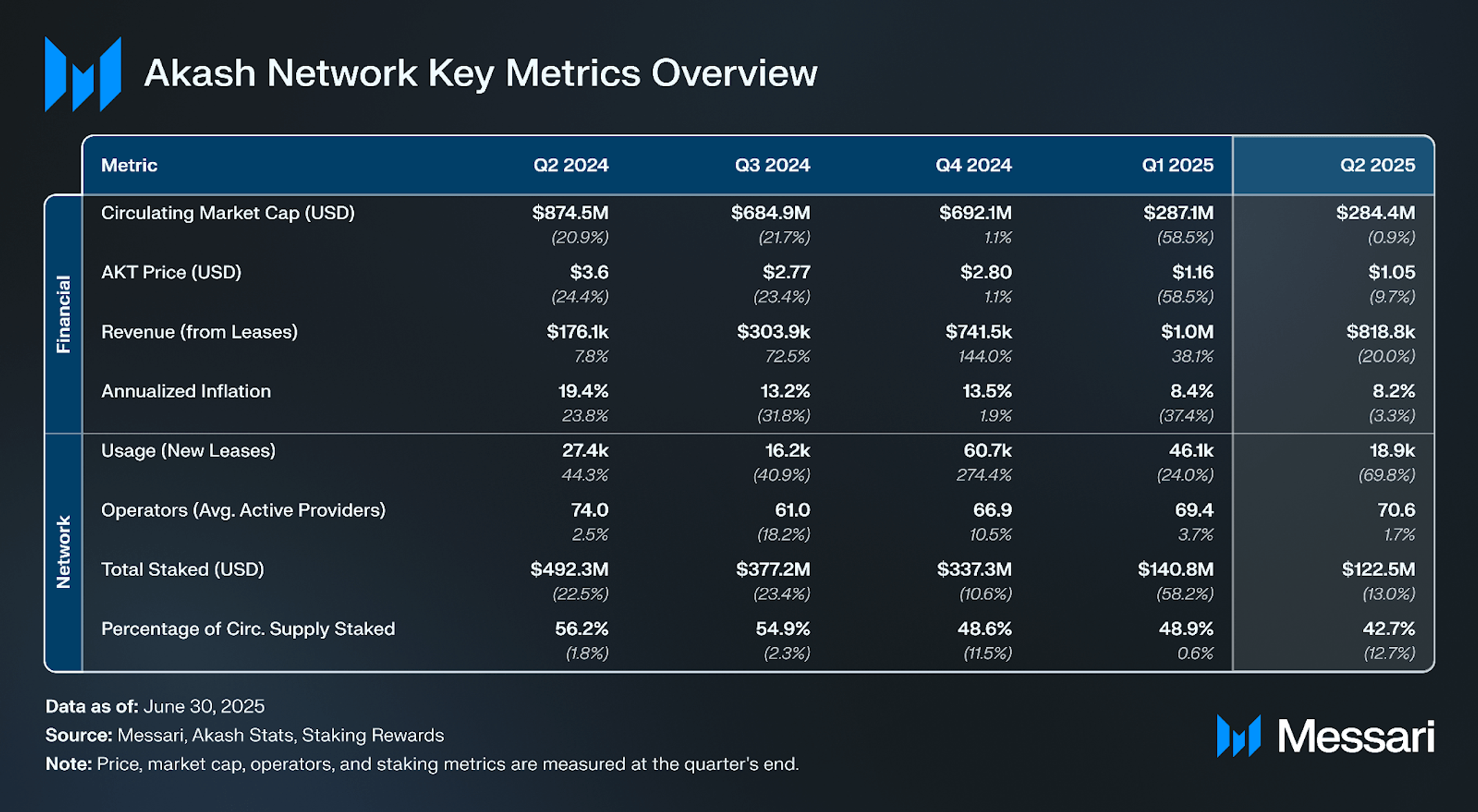 전반적으로 2025년 2분기는 아카시에서 더 높은 가치, 기업 및 AI 중심 사용으로의 전환을 강조했다. 임대 건수가 축소되었지만 AKT 기준 활용률과 수익은 탈중앙화 컴퓨팅에 대한 일관된 기저 수요를 강조했으며, 달러 수익은 토큰 가격 하락으로 압박을 받았다.