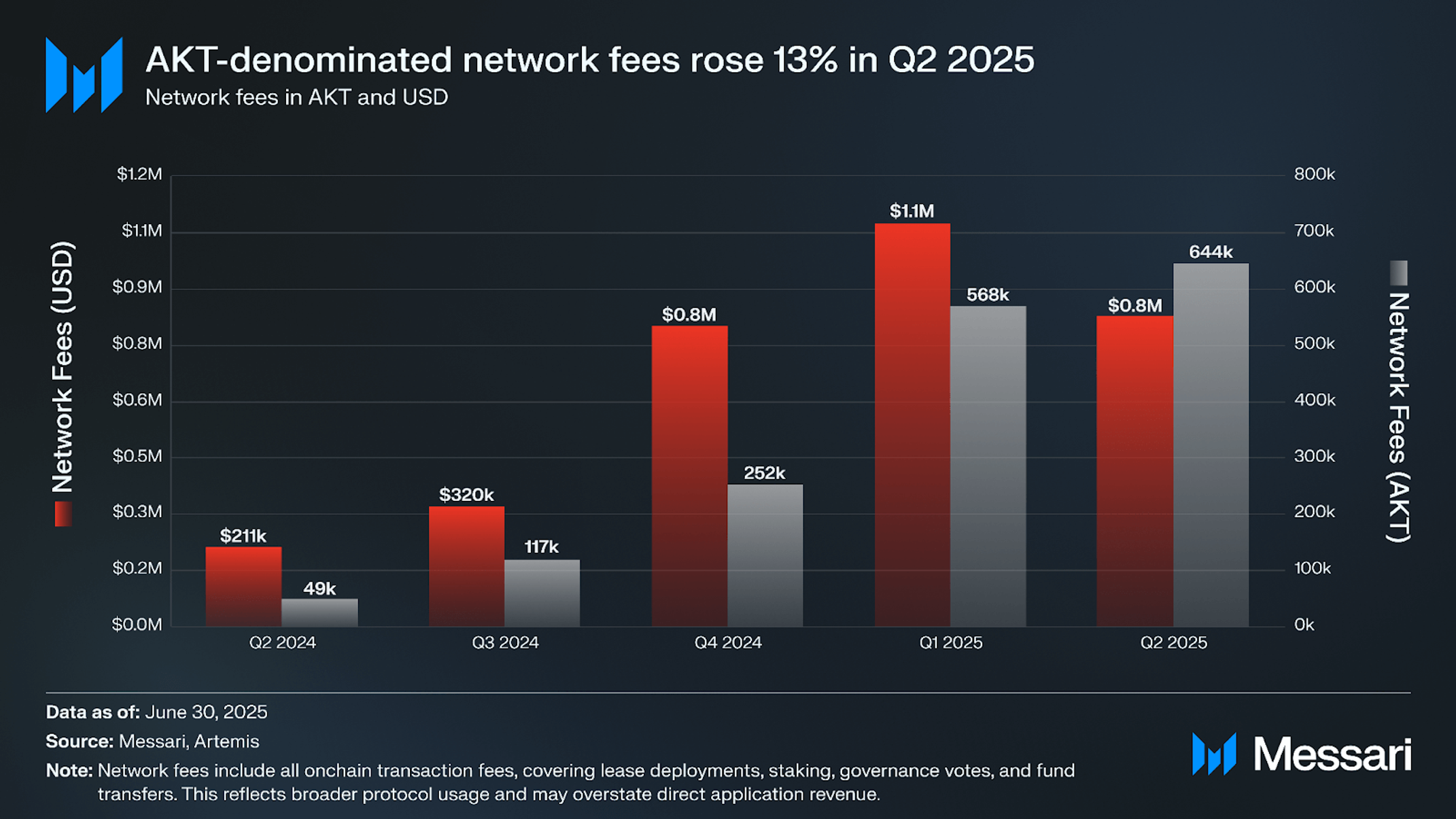 기본 수수료, 공급자 수수료율 및 기타 트랜잭션 수준 비용을 포함하는 네트워크 트랜잭션 수수료 수익은 AKT 기준으로 전분기 대비 13% 증가했다. 반면 달러로 측정한 수익은 2025년 1분기 110만 달러에서 2분기 80만 달러로 전분기 대비 27% 감소했다.