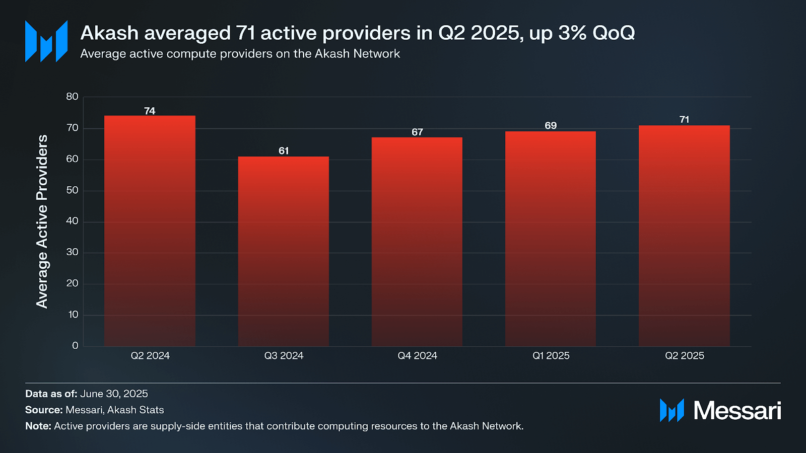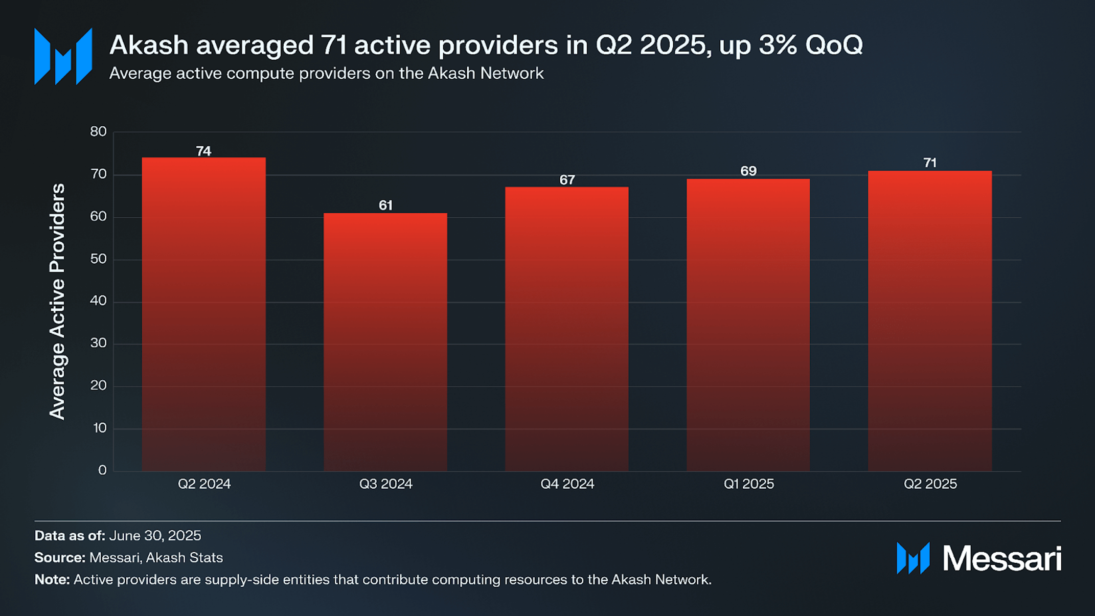 2025년 2분기에 활성 공급자 수는 69개에서 71개로 증가하여 전분기 대비 3%의 완만한 증가를 보였다. 성장은 데이터센터 운영자를 위한 설정 및 관리를 자동화한 공급자 콘솔(Provider Console)의 낮은 온보딩 장벽에 의해 뒷받침되었다. 58,000 달러의 지급액을 기록한 실리콘닷넷(Silicon.net)의 GPU NFT 파일럿과 같은 토큰화된 인프라 실험도 실제 수익 분배를 검증하고 신규 진입자들을 위한 인센티브를 강화했다.