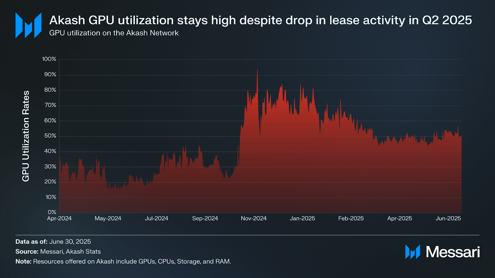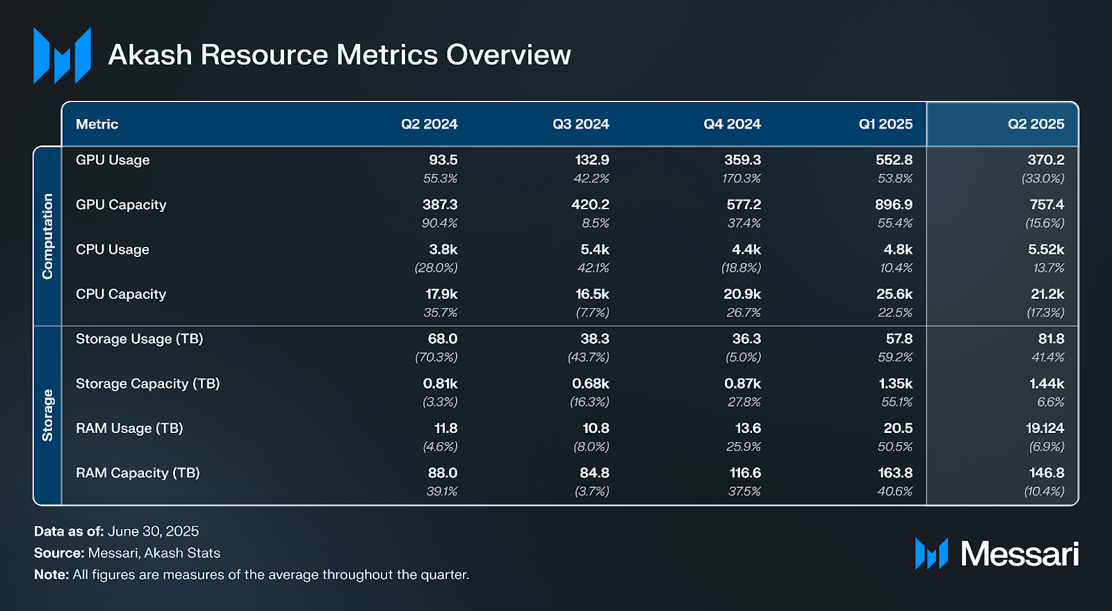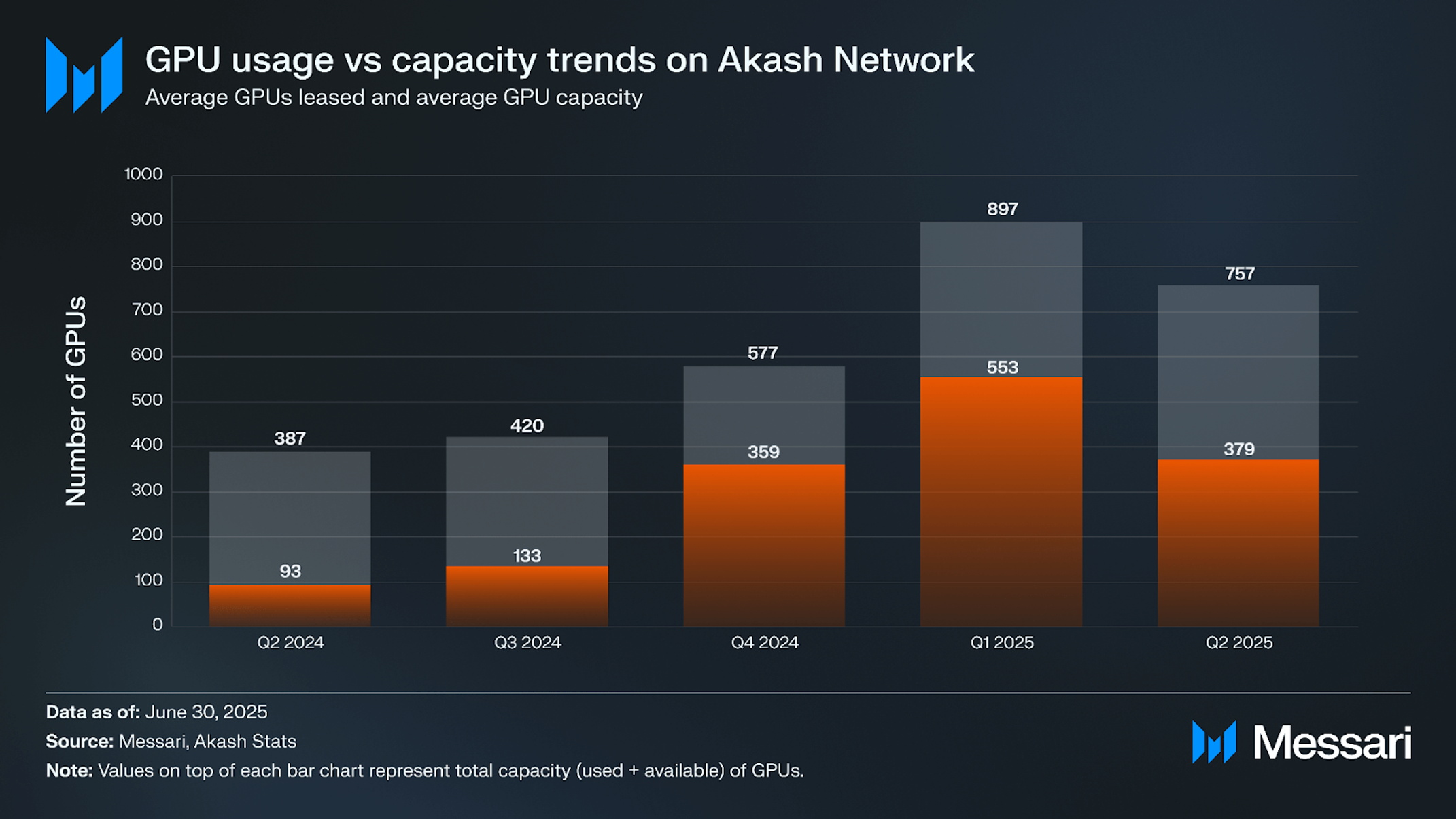 2025년 2분기에 아카시 네트워크의 신규 임대는 전분기 대비 59% 감소한 19,000건을 기록했지만, 활동이 더 적고 더 오래 지속되며 고가치인 배포로 통합되면서 수익은 더 회복력이 있어 20% 감소한 82만 달러를 기록했다. GPU 사용량은 용량이 16% 감소하면서 33% 축소되었지만, 활용 효율성은 50%로 안정적으로 유지되었고 6월 말에는 57%로 정점을 찍었다.