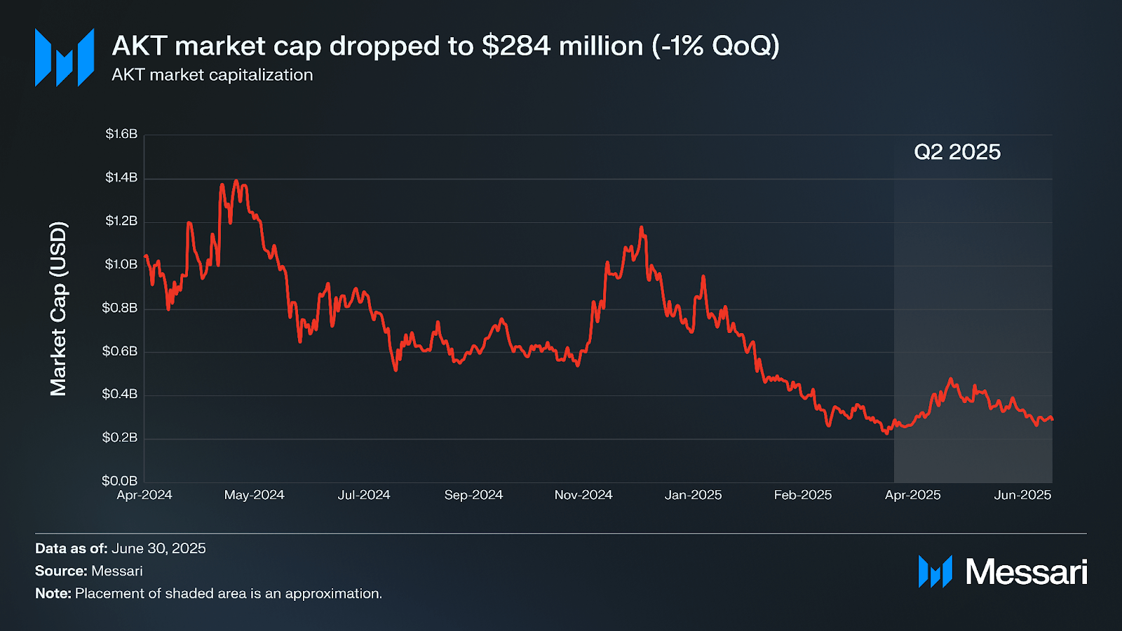 아카시의 유통 시가총액은 전분기 대비 1% 감소하여 2억 8,700만 달러에서 2억 8,400만 달러로 줄었고, 토큰 가격은 9.7% 하락하여 1.16 달러에서 1.05 달러로 떨어졌다. 2025년 5월 27일 그레이스케일은 AKT를 새로운 "AI 도구 및 리소스" 섹터 지수에 추가했고, 2025년 6월 2일 코인베이스는 AKT를 거래소에 상장된 상위 50개 디지털 자산의 시가총액 가중 벤치마크인 코인베이스 50(COIN50) 지수에 포함시켰다.