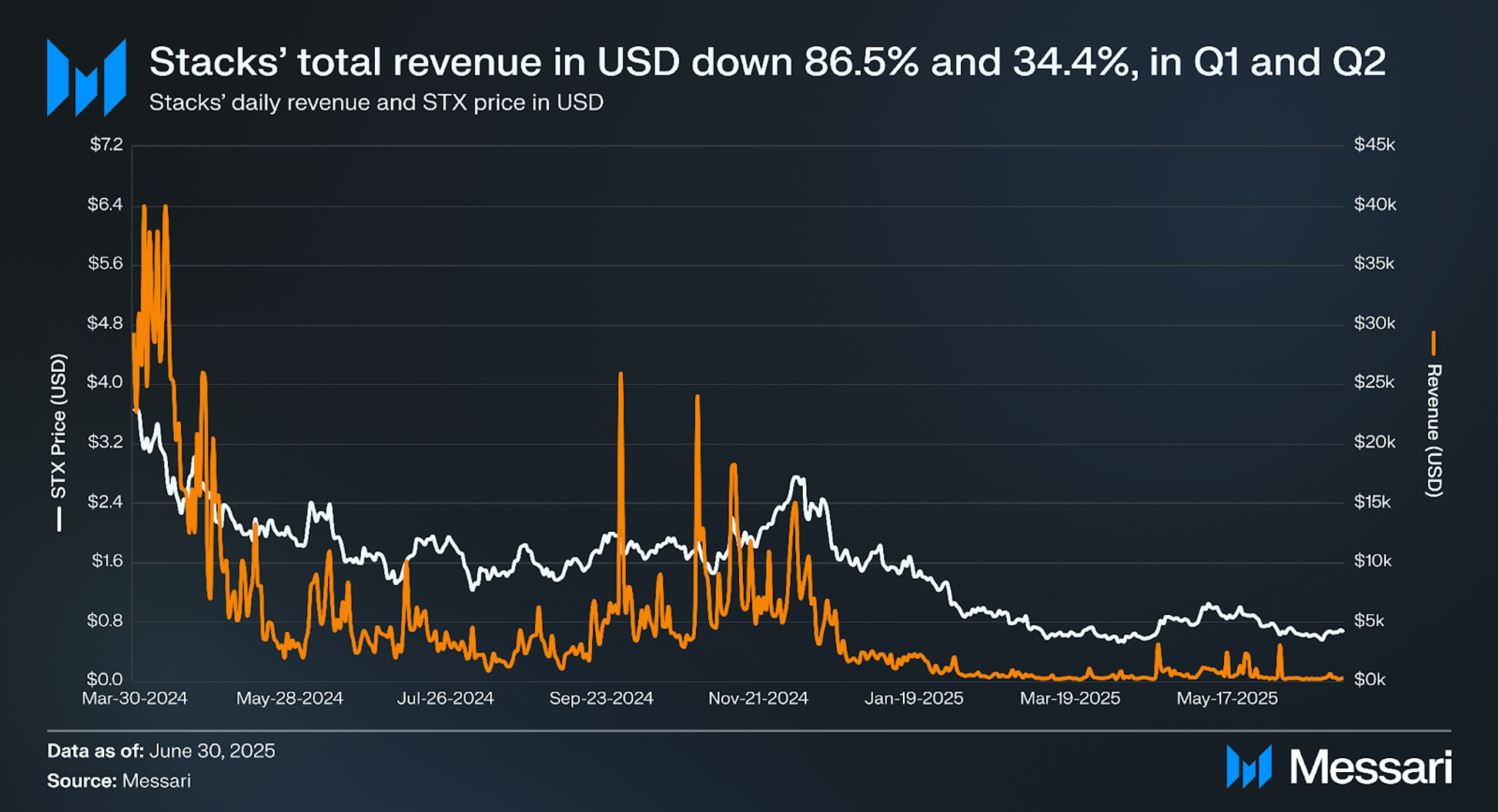 스택스의 수익은 총 거래 수수료로 측정되며, 스택스의 PoX 메커니즘을 통해 채굴자에게 분배된다(코인베이스 보상, 즉 발행과 함께). 2025년 1분기 달러 표시 수익은 전분기 대비 86.5퍼센트 감소하여 604,923 달러에서 81,844 달러로 하락했다. 에스티엑스 표시 수익은 보다 완만하게 하락하여 311,073 에스티엑스에서 69,796 에스티엑스로 77.6퍼센트 감소했다. 2분기에 이러한 차이는 더욱 확대되었다. 달러 표시 수익은 전분기 대비 34.4퍼센트 추가 하락하여 53,713 달러가 되었지만, 에스티엑스 표시 수익은 70,111 에스티엑스로 거의 보합이었다. 에스티엑스 기준의 상대적 안정성은 가격 조치가 달러 표시 수익을 약화시켰지만 온체인 활동은 일관되게 유지되었음을 시사한다.