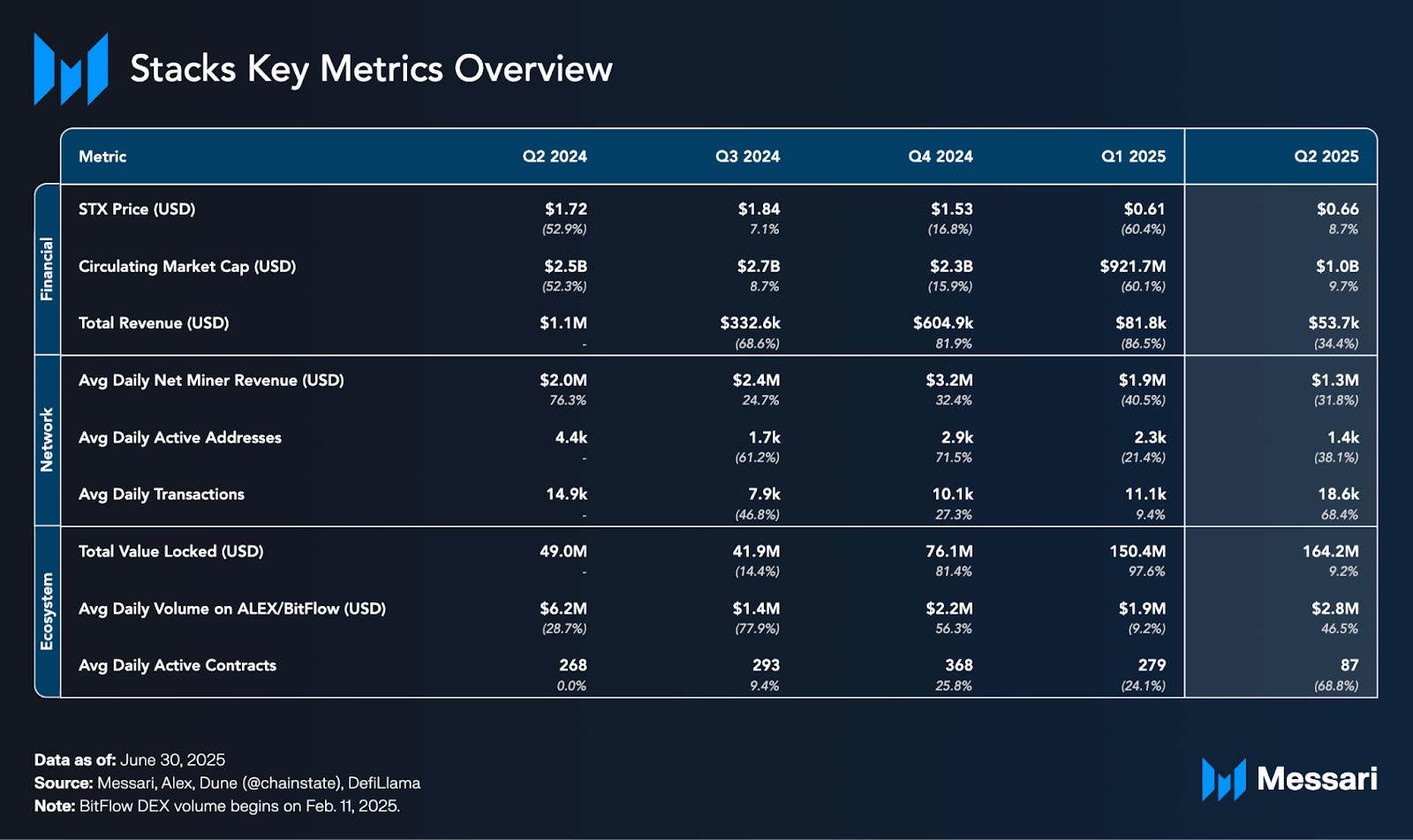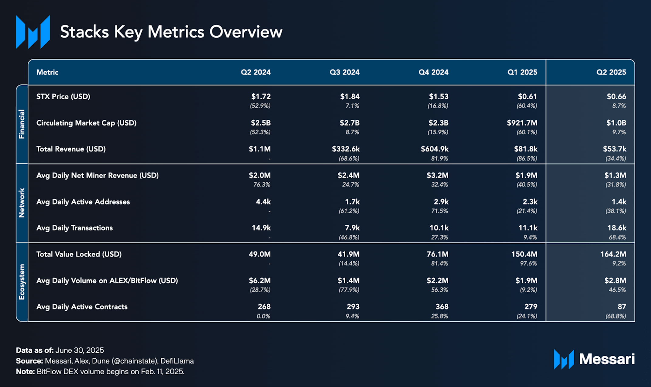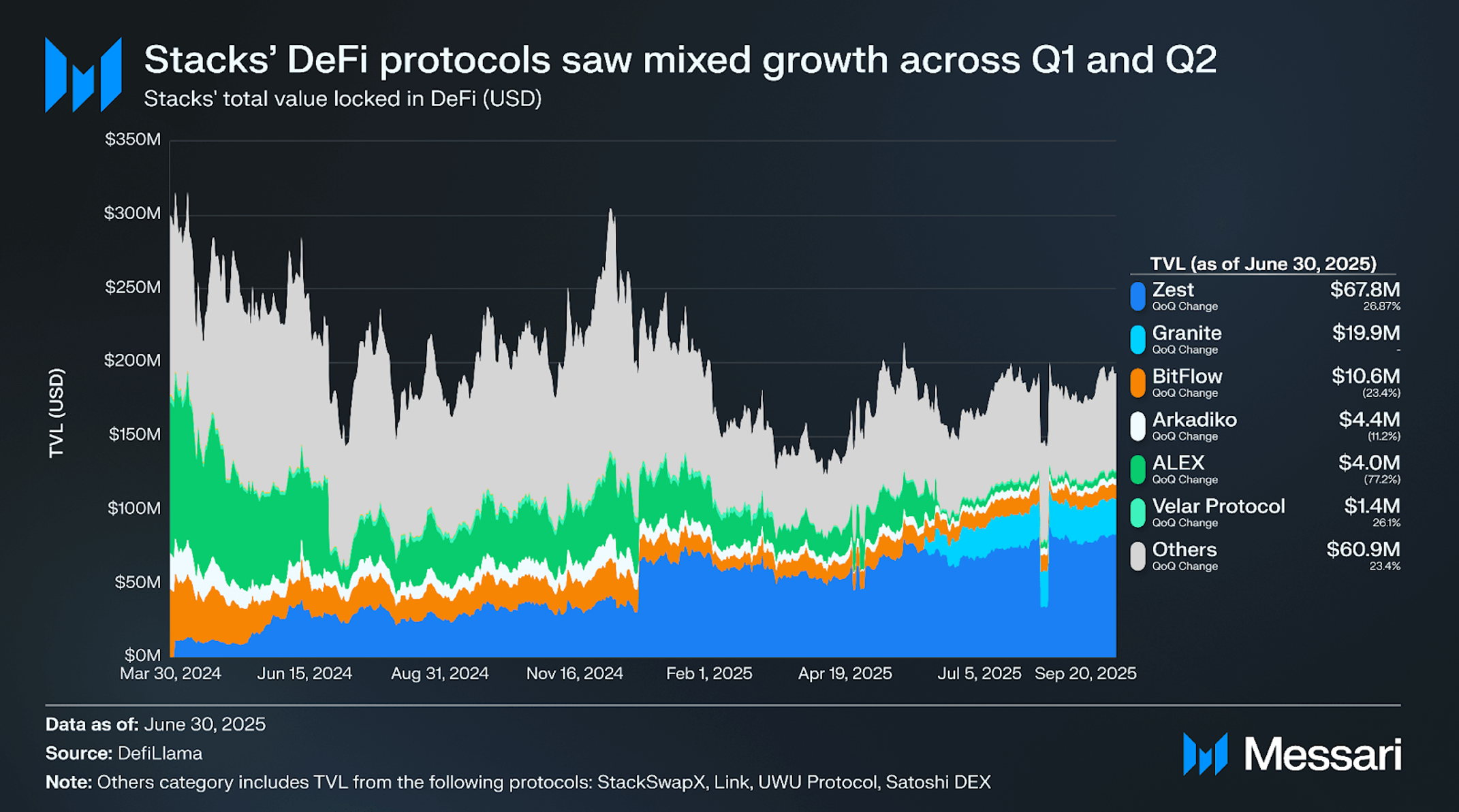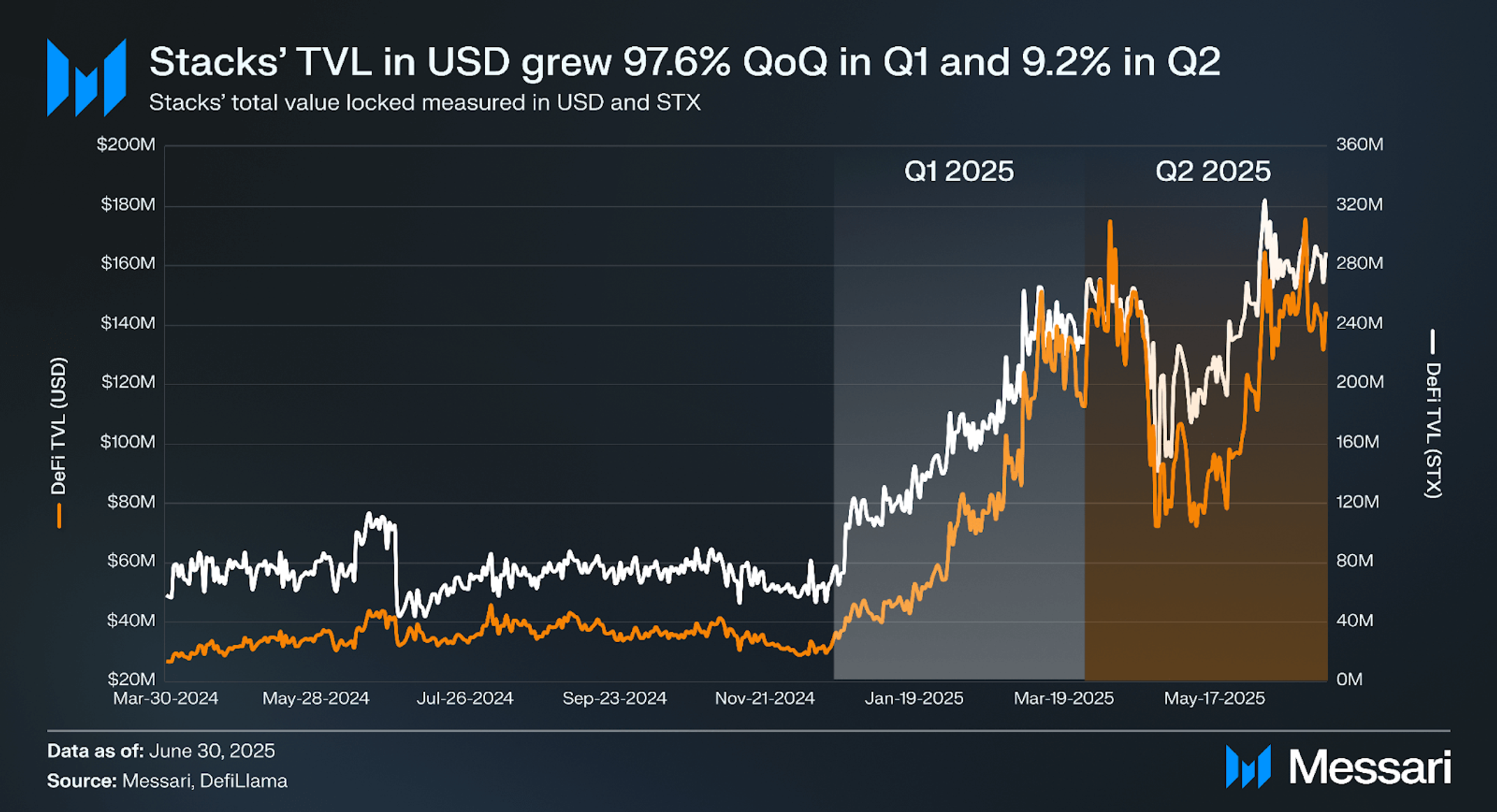 스택스의 상위 디파이 프로토콜 전체 티브이엘은 2025년 1분기에 26.8퍼센트 감소하여 9,660만 달러가 되었다가 2분기에 12.2퍼센트 회복하여 1억 830만 달러가 되어 안정화 및 갱신된 활동의 조짐을 보였으며, 이는 3월 저점 이후의 일이다.