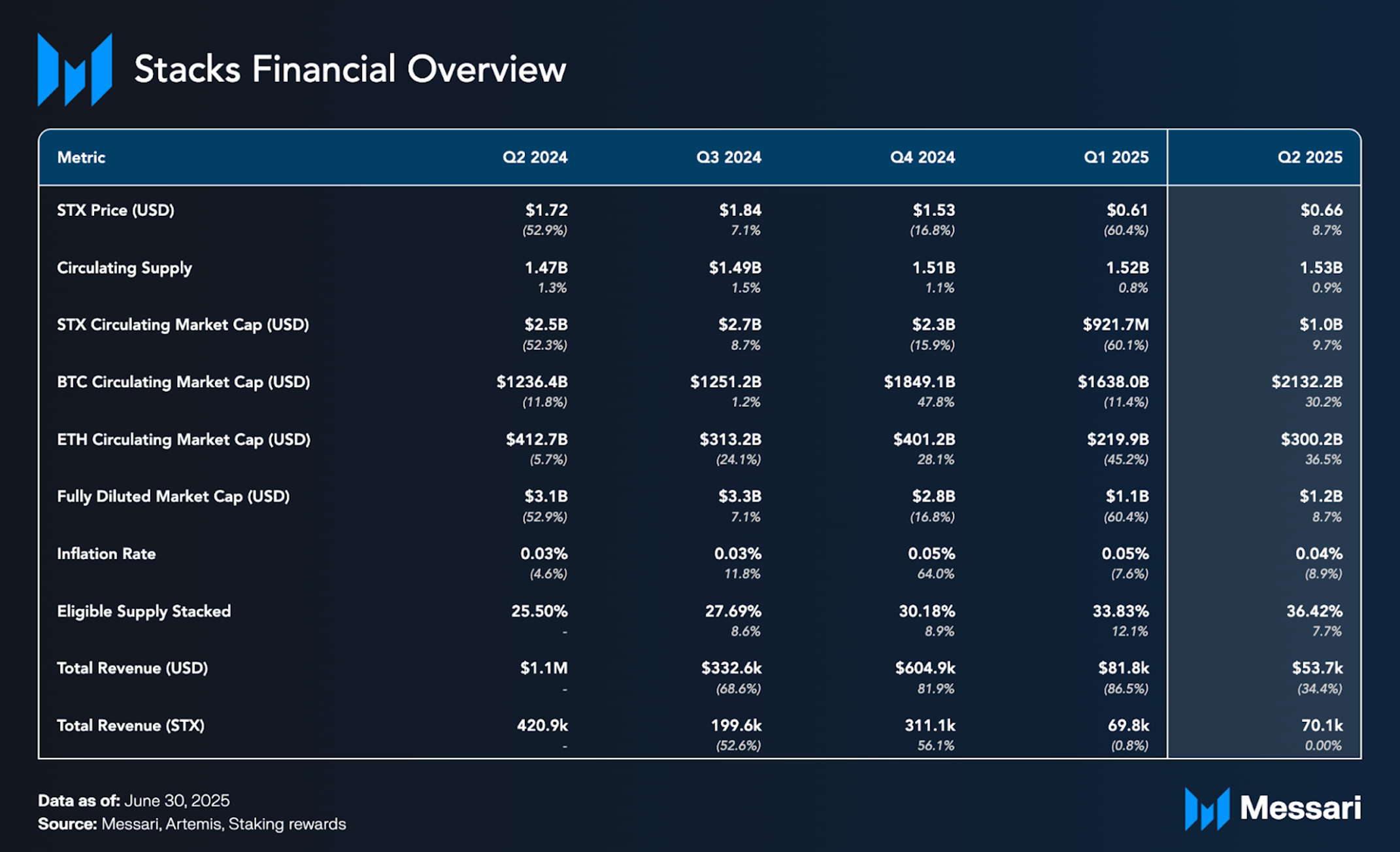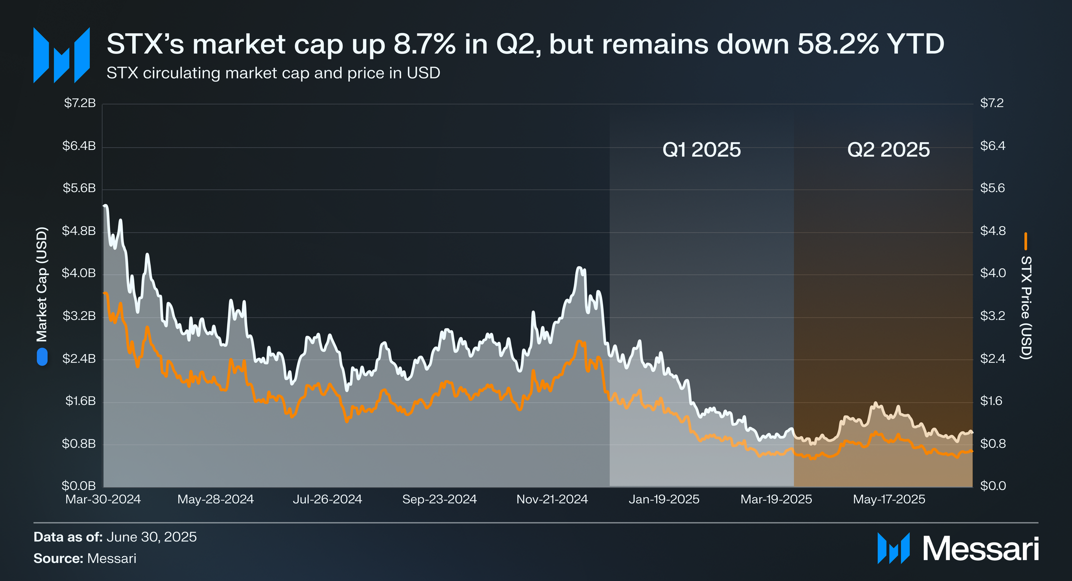 2분기에는 비트코인과 이더리움이 각각 전분기 대비 30.2퍼센트 및 36.5퍼센트 상승하며 회복했다. 스택스는 9억 2,170만 달러에서 10억 달러로 9.7퍼센트 상승했지만, 시가총액 순위는 69위로 더 하락했다. 에스티엑스 가격은 비슷한 궤적을 따랐으며, 1분기에 1.53 달러에서 0.61 달러로 60.4퍼센트 하락한 후 2분기에 8.7퍼센트 상승하여 0.66 달러가 되었다. 연초 대비 에스티엑스는 시가총액 58.3퍼센트, 가격 59.0퍼센트 하락하여 23억 1,000만 달러에서 10억 1,000만 달러로, 1.53 달러에서 0.66 달러로 각각 떨어졌다.