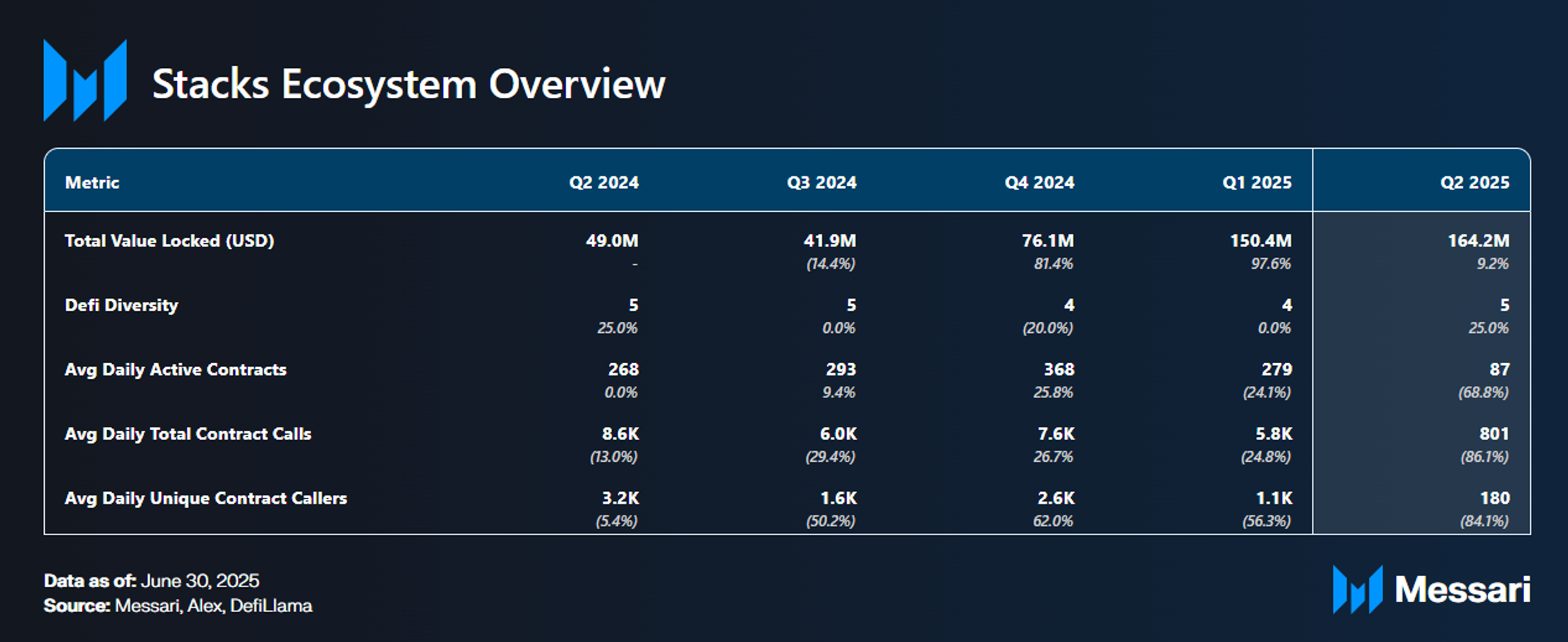 2024년 4분기에서 2025년 1분기로 스택스의 디파이 총 예치 가치(TVL)는 7,610만 달러에서 1억 5,040만 달러로 97.6퍼센트 상승했다. 이러한 성장은 2분기에도 계속되어 티브이엘이 9.2퍼센트 추가 증가하여 1억 6,420만 달러가 되었다. 하지만 컨트랙트 수준 활동은 반대 방향으로 추세를 보였다.