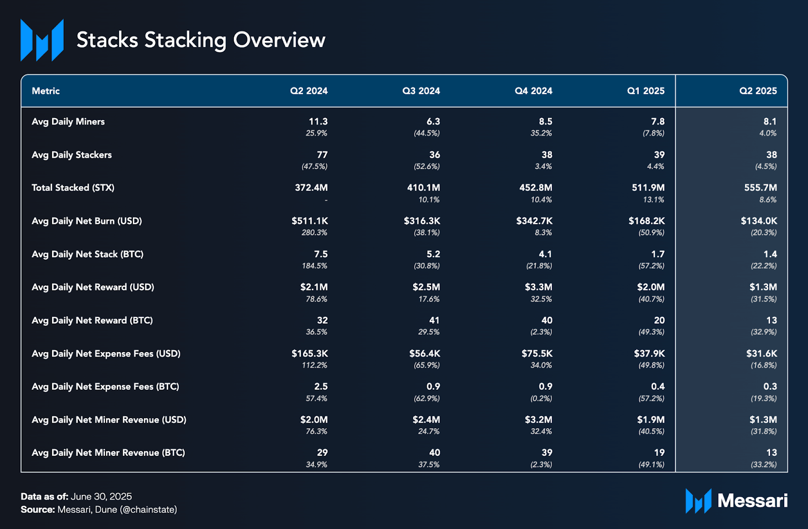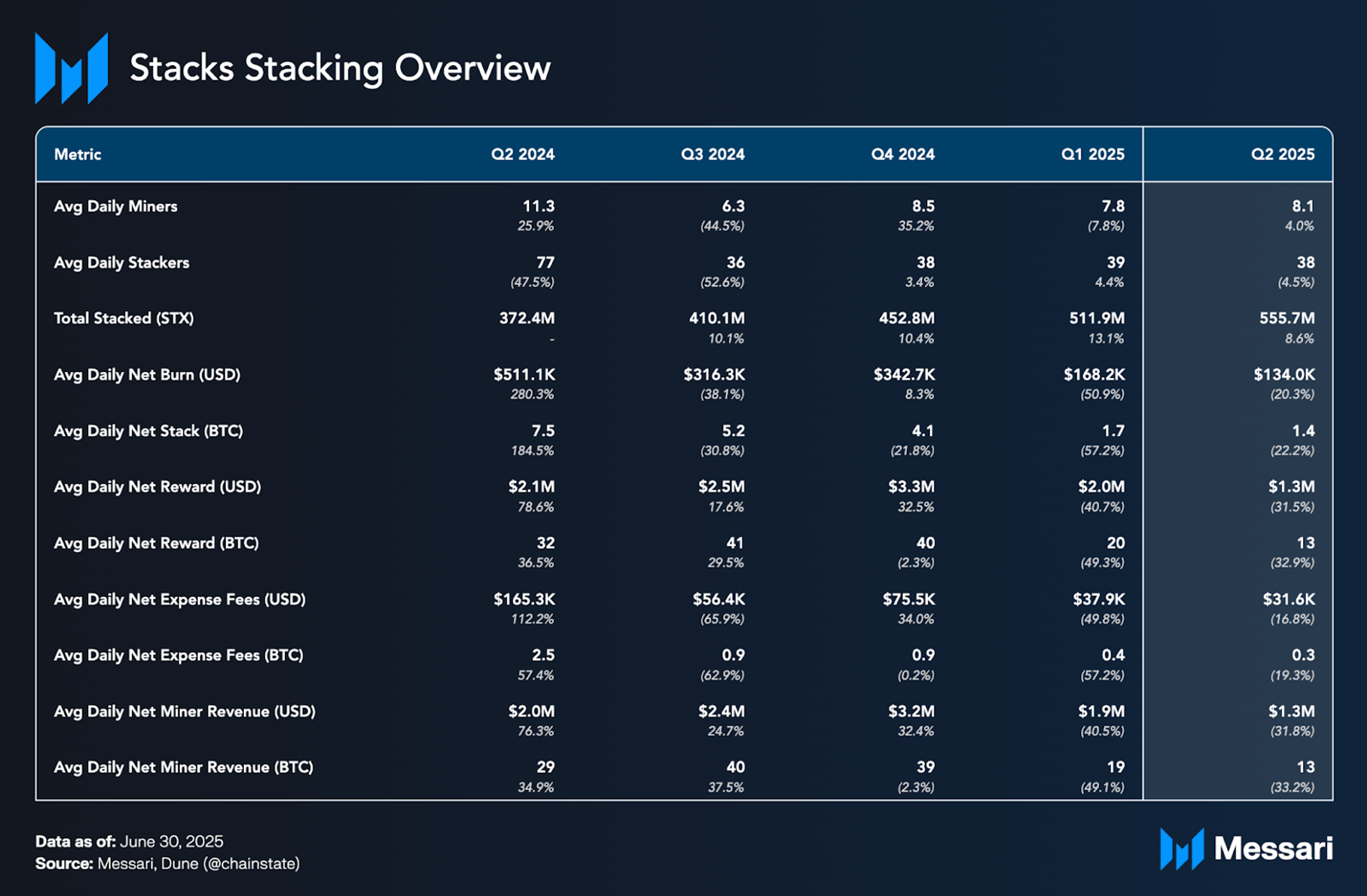 이러한 둔화의 영향은 자본 흐름과 경제적 인센티브 전반에 걸쳐 눈에 띄었다. 평균 일일 순 소각은 1분기에 하루 342,700 달러에서 168,200 달러로 하락했고(-50.9퍼센트), 2분기에 하루 134,000 달러로 더 감소했다(-20.3퍼센트). 마찬가지로 평균 일일 순 스택 볼륨은 1분기에 4.1 비트코인에서 1.7 비트코인으로 감소했고(-57.2퍼센트), 2분기에 하루 1.4 비트코인으로 다시 감소했다(-22.2퍼센트). 이러한 하락은 스택스의 PoX 메커니즘이 비트코인에 밀접하게 의존하고 있음을 나타낸다. 구체적으로 비트코인이 에스티엑스보다 빠르게 상승하면 경제적 인센티브가 일시적으로 어긋날 수 있다.