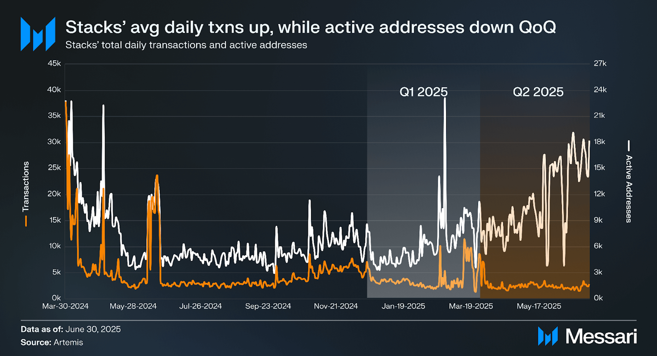 평균 일일 거래 건수는 사용자 감소에도 불구하고 스택스 생태계 전반에 걸쳐 디파이 프로토콜이 견인력을 얻으면서 2분기에 증가했다. 4분기에서 1분기로 평균 일일 거래 건수는 10,110건에서 11,059건으로 9.4퍼센트 증가했다. 이러한 성장은 2분기에 더욱 증가하여 18,622건으로 68.4퍼센트 급증했다. 반면 평균 일일 활성 주소는 2025년에 계속 감소했다. 4분기에서 1분기로 활성 주소는 2,902개에서 2,281개로 21.4퍼센트 감소했다. 이는 2분기에 가속화되어 전분기 대비 38.1퍼센트 감소하여 2,281개에서 1,412개로 떨어졌는데, 이는 에스티엑스-20 인스크립션과 새로운 프로토콜 출시로 인한 연초 활동이 줄어들었기 때문이다.