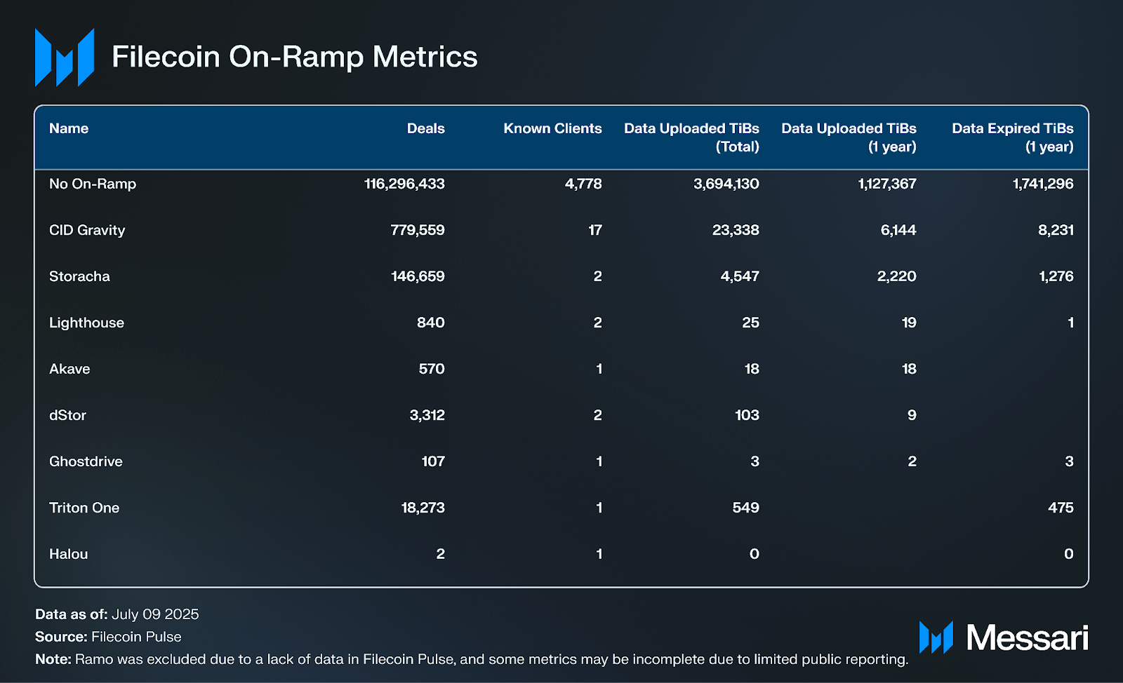 • 2025년 중반 기준, 파일코인 온램프는 약 95만 건의 스토리지 거래에 걸쳐 약 28,600 테비바이트(TiB)의 데이터를 촉진했으며, 이는 생태계 내에서 더 구조화되고 인터페이스 중심의 온보딩으로의 점진적 전환을 반영한다.