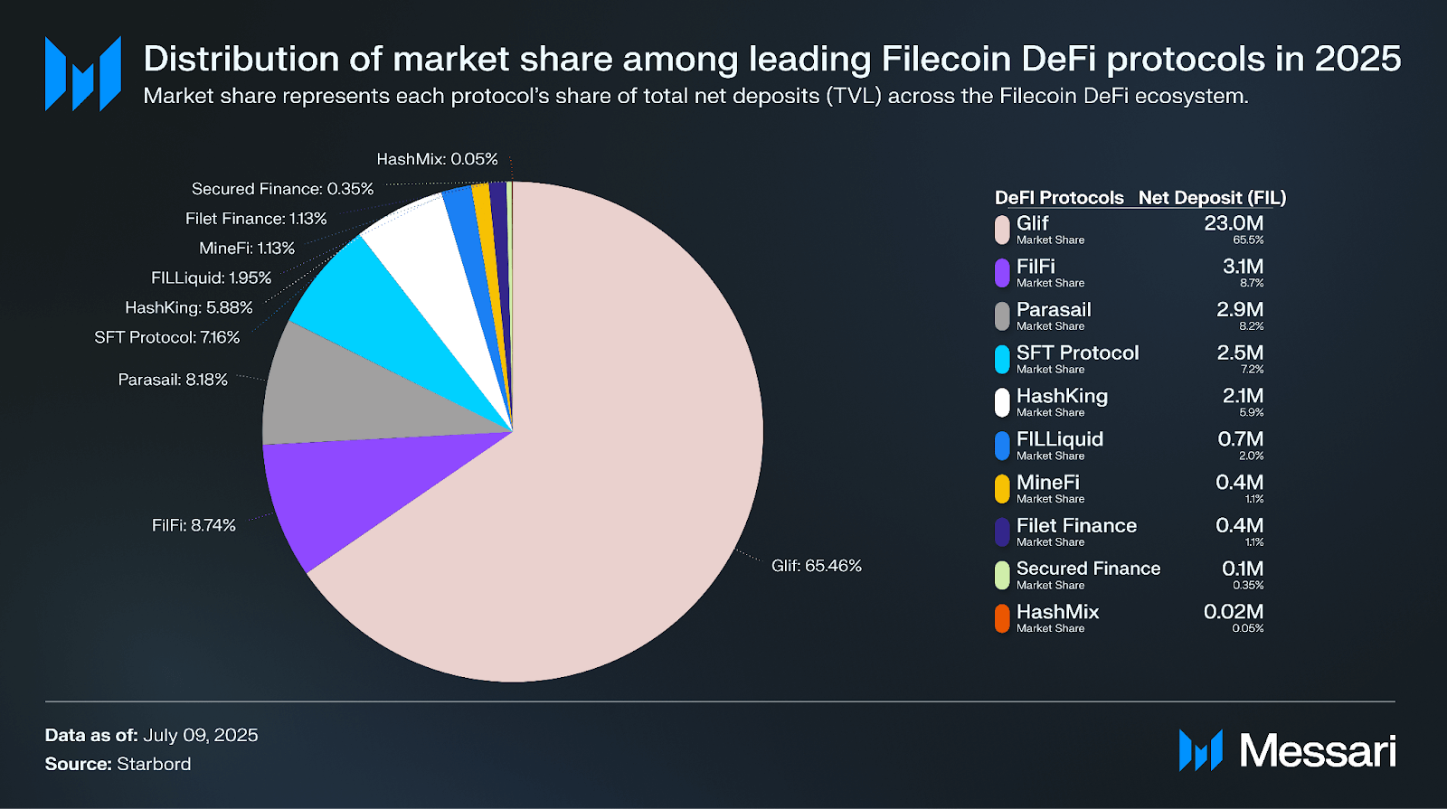 • 글리프(Glif)는 파일코인 디파이의 순예치금 중 약 65%를 보유하고 있으며, 파라세일(Parasail)과 SFT 프로토콜(SFT Protocol) 같은 신흥 프로토콜이 스토리지 시장의 자금 조달 요구에 맞춤화된 더 다양한 자본 계층에 기여하고 있다.