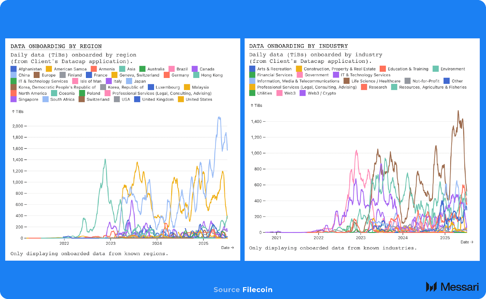 산업 전반에 걸쳐 생명과학 및 헬스케어 섹터는 특히 2024년 말부터 2025년까지 Fil+ 프로그램을 통한 온보딩이 눈에 띄게 증가했다. 이는 과학 연구, 임상 데이터 스토리지 또는 장기 아카이빙에 초점을 맞춘 증가하는 사용 사례 수에 의해 주도될 수 있다. IT 및 기술 서비스, 웹3/암호화폐, 교육 및 훈련을 포함한 기타 지속적으로 활발한 섹터는 신흥 및 기존 데이터 범주 전반에 걸친 Fil+ 인센티브의 광범위한 적용 가능성을 시사한다.