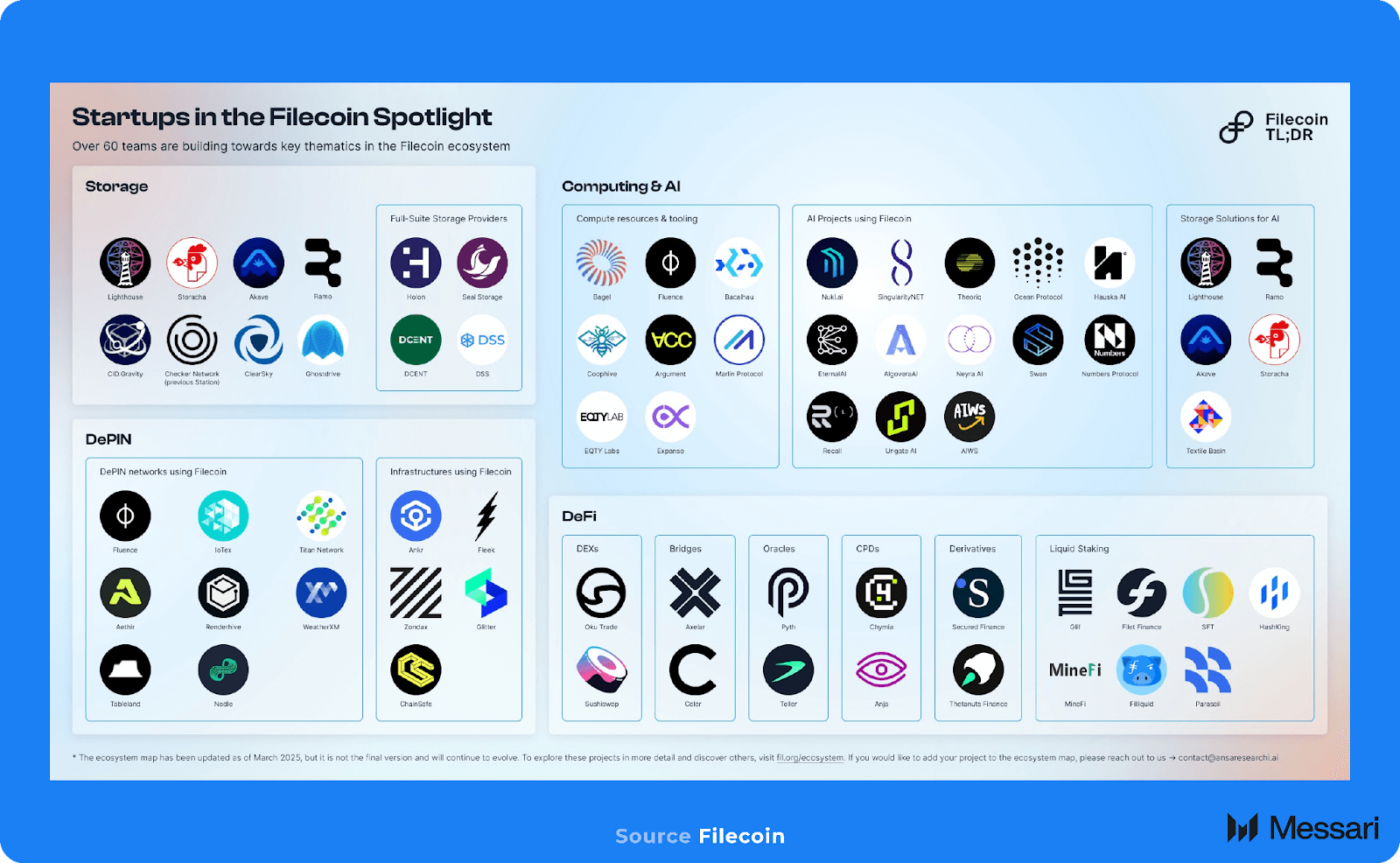 생태계는 계속 다양화되고 있으며 스토리지 및 검색 제공자, 하이브리드 인프라 플랫폼, FIL 담보 스테이블코인(예: USDFC) 및 자본 리스 메커니즘(예: iFIL) 같은 디파이 애플리케이션을 포함한다. 보조금, 개발자 프로그램, 크로스체인 통합을 포함한 파일코인 재단과 프로토콜 랩스의 지속적인 이니셔티브는 채택을 강화하고 웹3, AI, 과학 데이터 커뮤니티 전반에 걸쳐 네트워크의 범위를 확대했다.