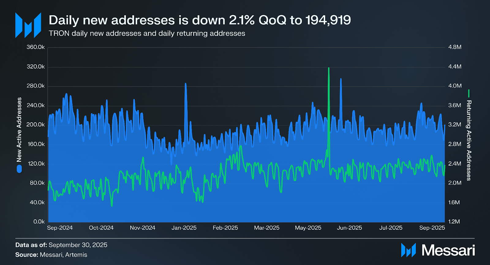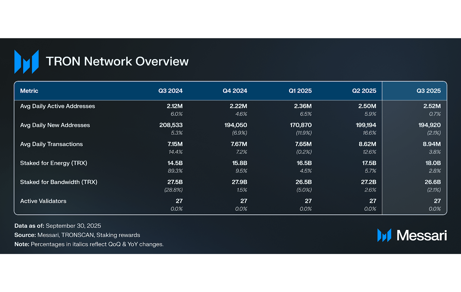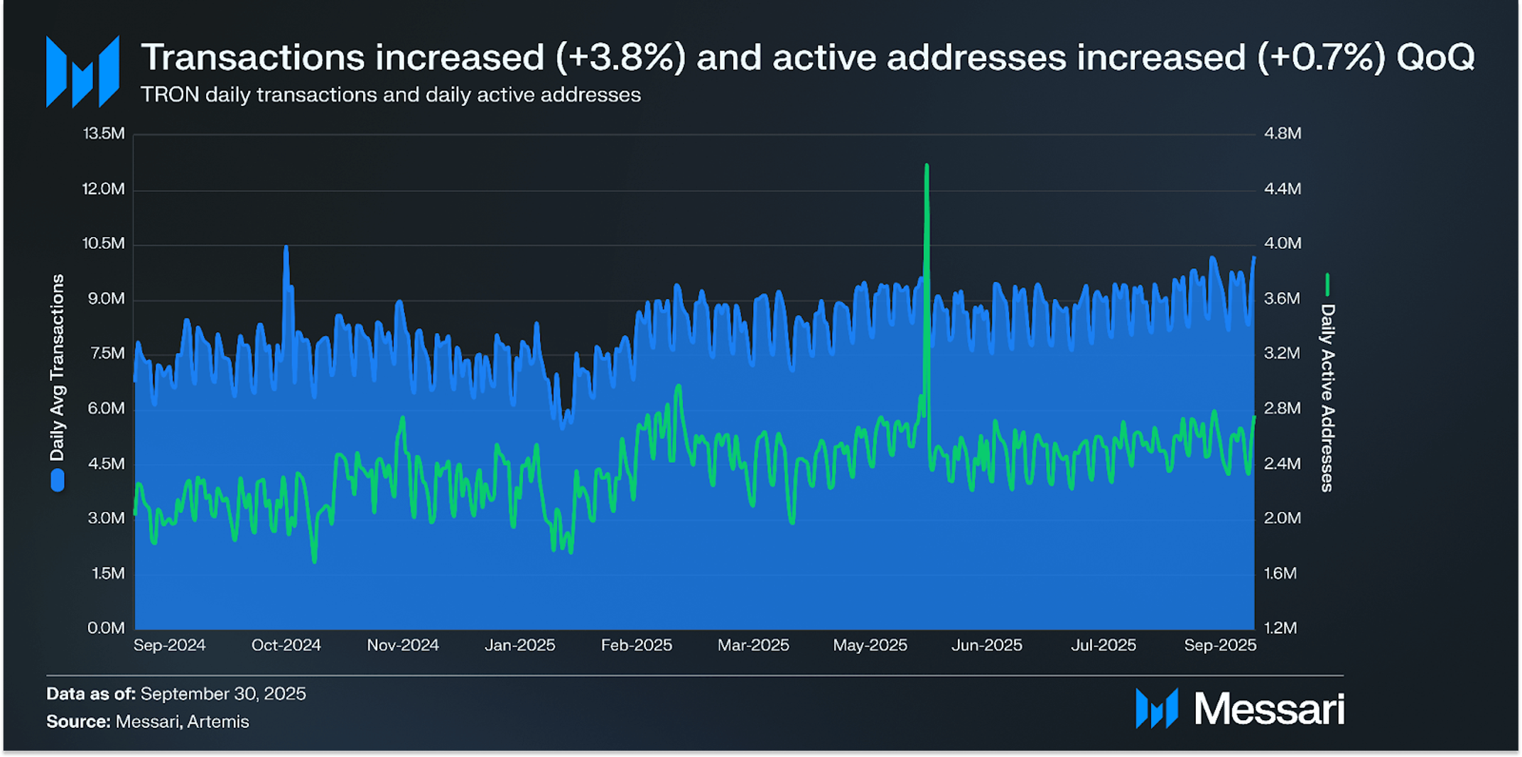 3분기 사용량은 트론에게 긍정적이었으며, 일평균 거래 및 일평균 활성 주소 같은 온체인 활동 지표가 증가했다. 일평균 거래는 전분기 대비 3.8% 증가한 862만에서 894만이 되었고, 일평균 활성 주소는 전분기 대비 0.7% 증가한 250만에서 252만이 되었다.