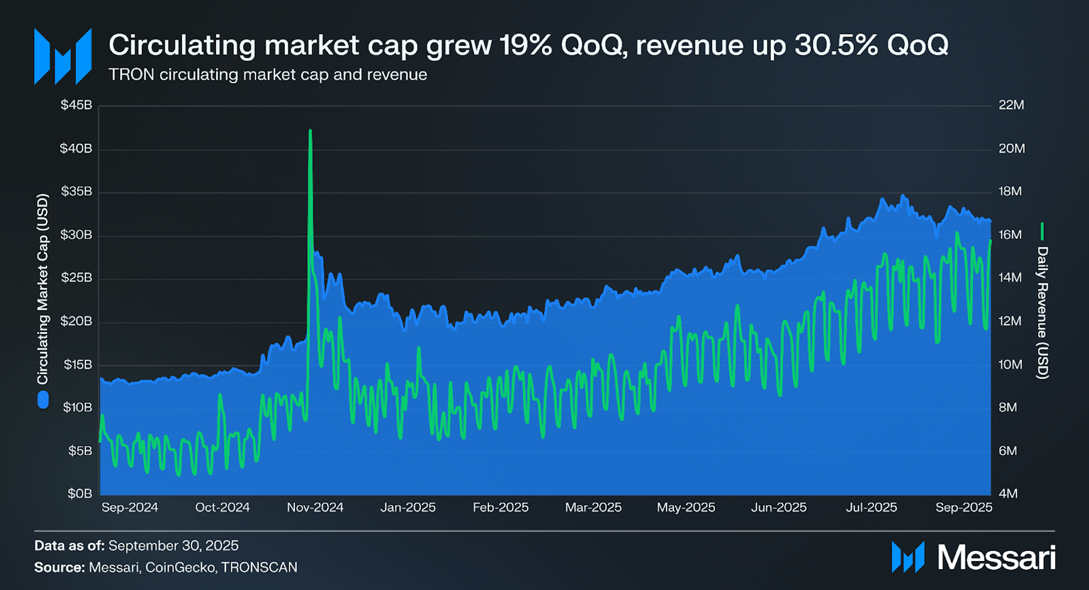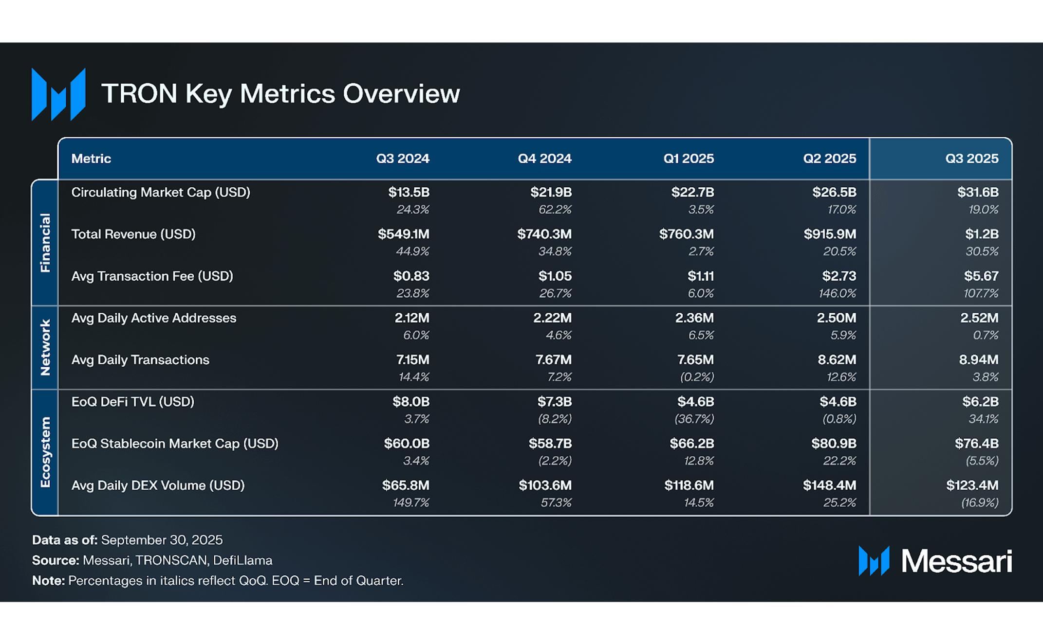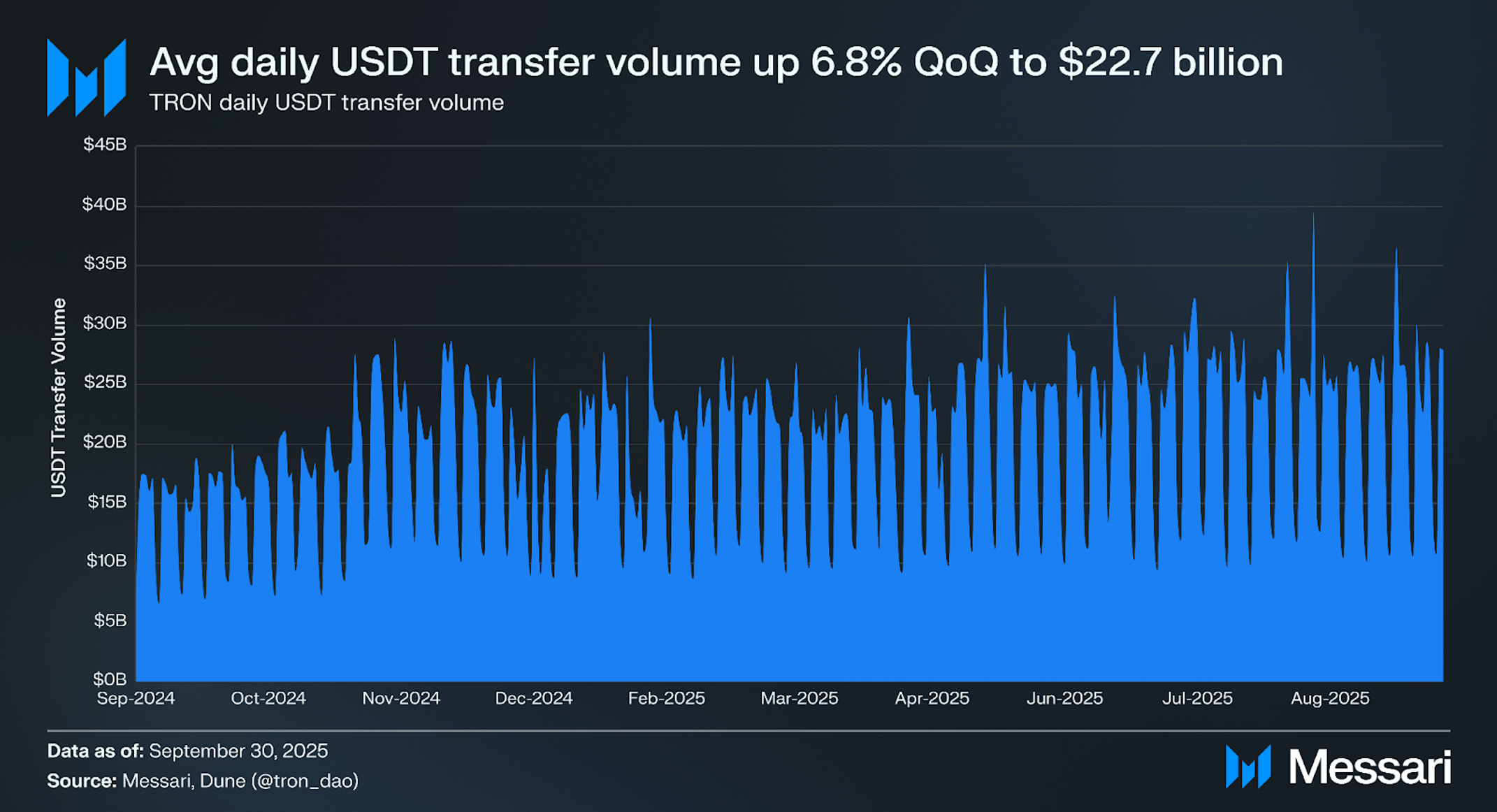 3분기 사용량은 트론에게 긍정적이었으며, 일평균 거래 및 일평균 활성 주소 같은 온체인 활동 지표가 증가했다. 일평균 거래는 전분기 대비 3.8% 증가한 862만에서 894만이 되었고, 일평균 활성 주소는 전분기 대비 0.7% 증가한 250만에서 252만이 되었다.