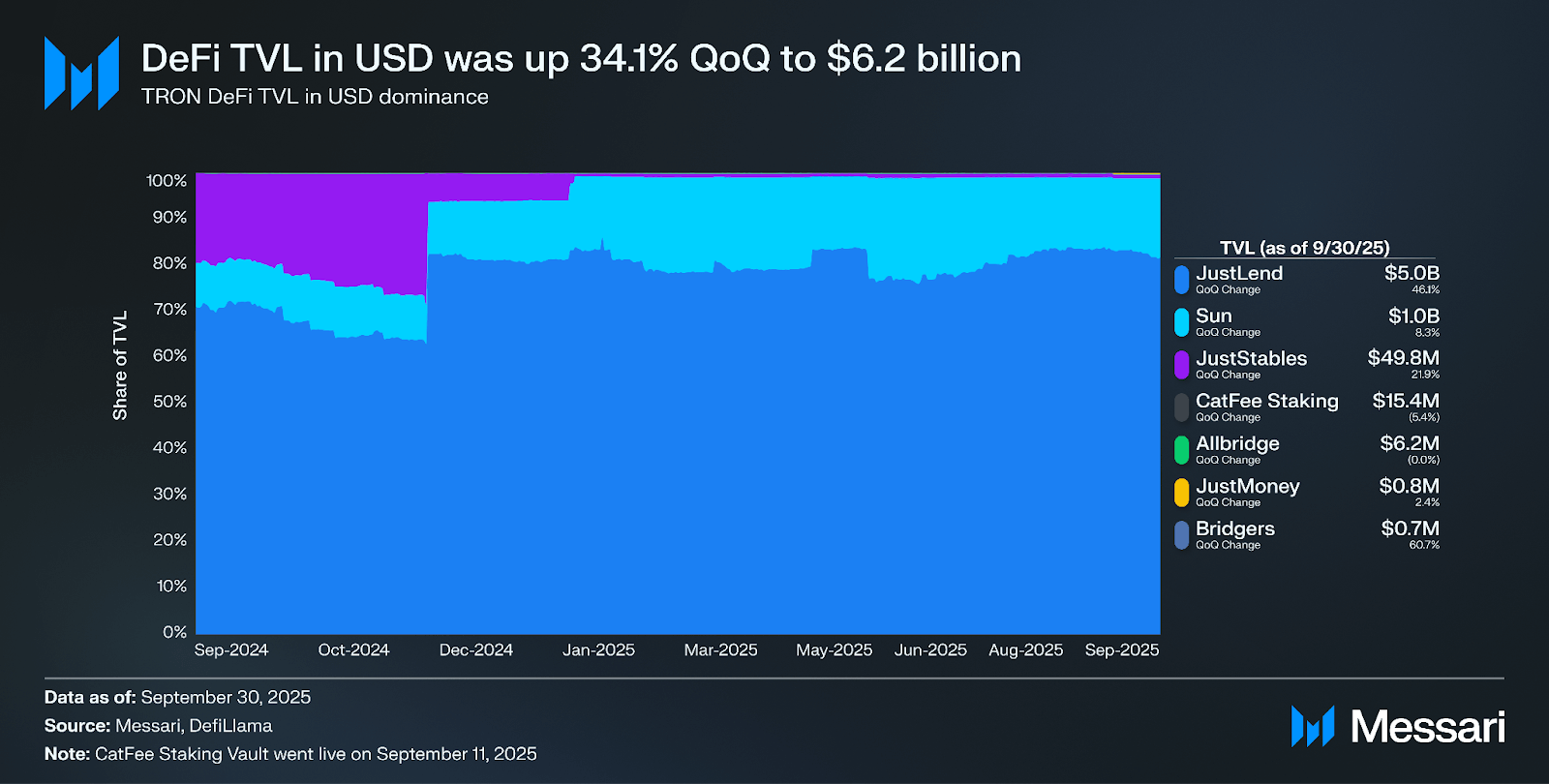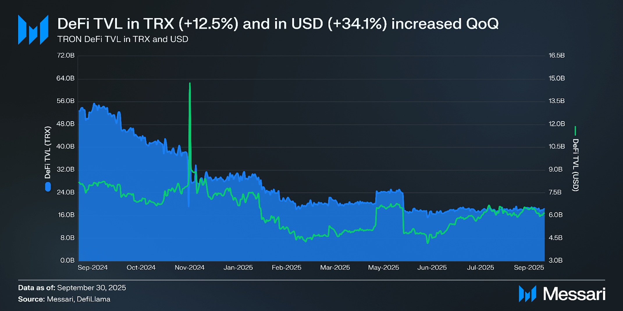 TRX로 표시된 트론의 디파이 총예치자산은 전분기 대비 12.5% 증가한 165억에서 185억이 되었다. 미국 달러로 표시된 총예치자산도 증가하여 전분기 대비 34.1% 상승한 46억 달러에서 62억 달러가 되었다. 다른 네트워크와 비교할 때 트론은 62억 달러로 총예치자산 기준 5번째로 높은 네트워크로서의 순위를 유지했으며, 4위 비트코인(83억 달러), 3위 BNB 체인(90억 달러), 2위 솔라나(109억 달러), 1위 이더리움(875억 달러)에 뒤졌다. 2024년 4분기 미국 달러 기준 디파이 총예치자산의 큰 급증은 TRX 가격의 갑작스러운 상승과 2025년 1분기의 후속 하락 때문이었다.