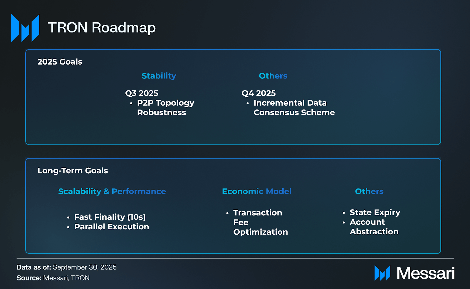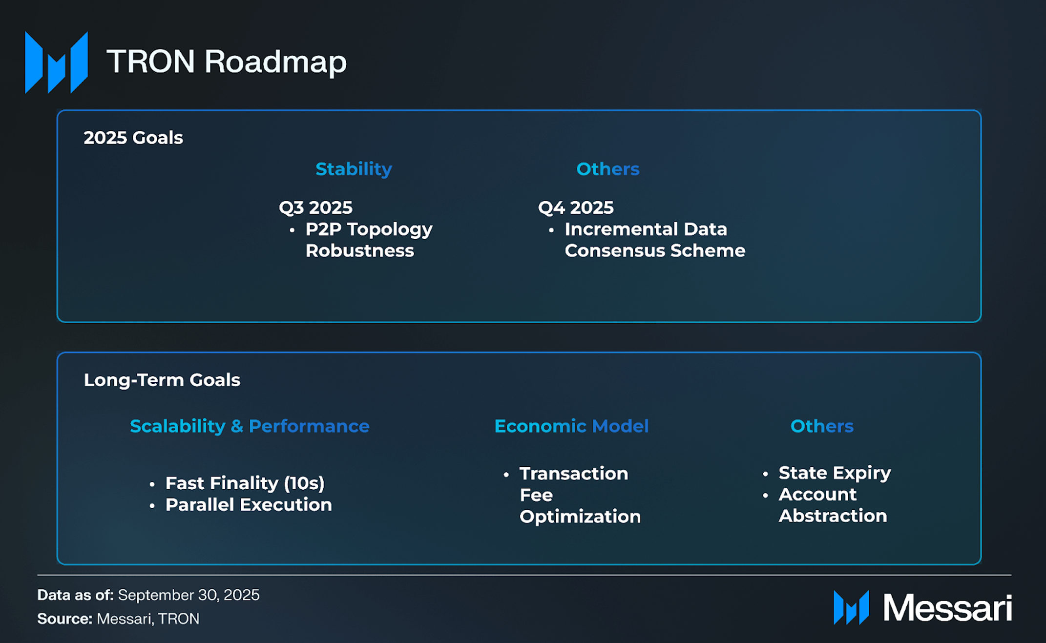 2025년 트론은 P2P 토폴로지 견고성을 높여 네트워크 안정성을 향상시키는 데 집중할 것이다. 동적 거래 수수료 조정 같은 경제 모델 개선은 생태계의 지속가능성을 강화하는 것을 목표로 한다. 장기적으로 트론은 견고한 인프라와 미래 적응성을 보장하기 위해 계정 추상화 및 상태 데이터 만료 같은 다른 영역을 탐색할 계획이다.