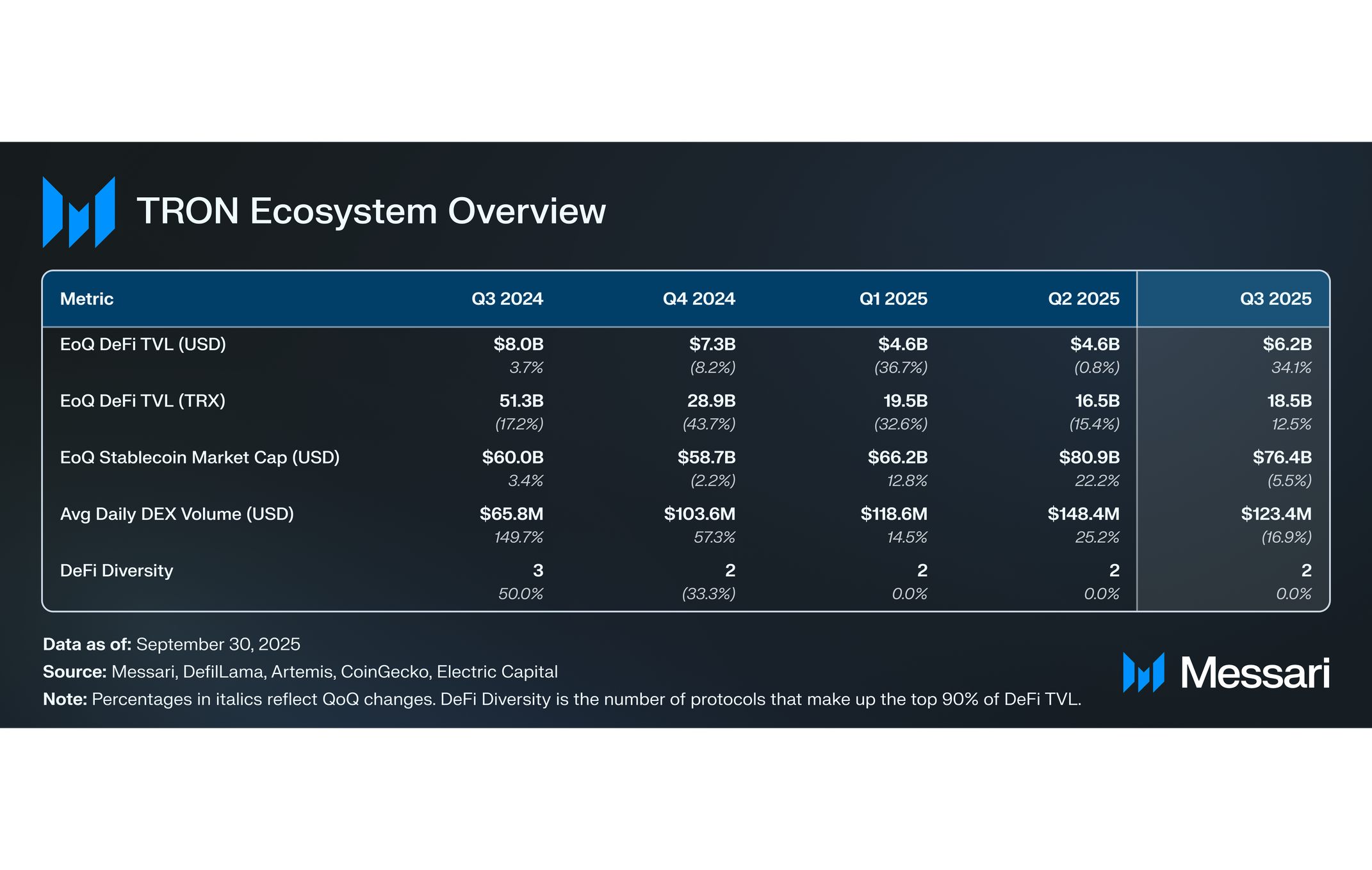 이 보고서는 트론 네트워크(Tron Network Limited)의 의뢰로 작성됐습니다. 모든 콘텐츠는 저자(들)에 의해 독립적으로 작성되었으며, Messari Inc. 또는 보고서를 의뢰한 기관의 의견을 반드시 반영하는 것은 아닙니다. 의뢰 기관이 보고서 내용에 일부 의견을 제시할 수 있으나, Messari는 데이터의 정확성과 객관성을 유지하기 위해 최종 편집권을 보유합니다. 또한, 저자(들)는 이 보고서에서 언급된 암호화폐를 보유하고 있을 수 있습니다.