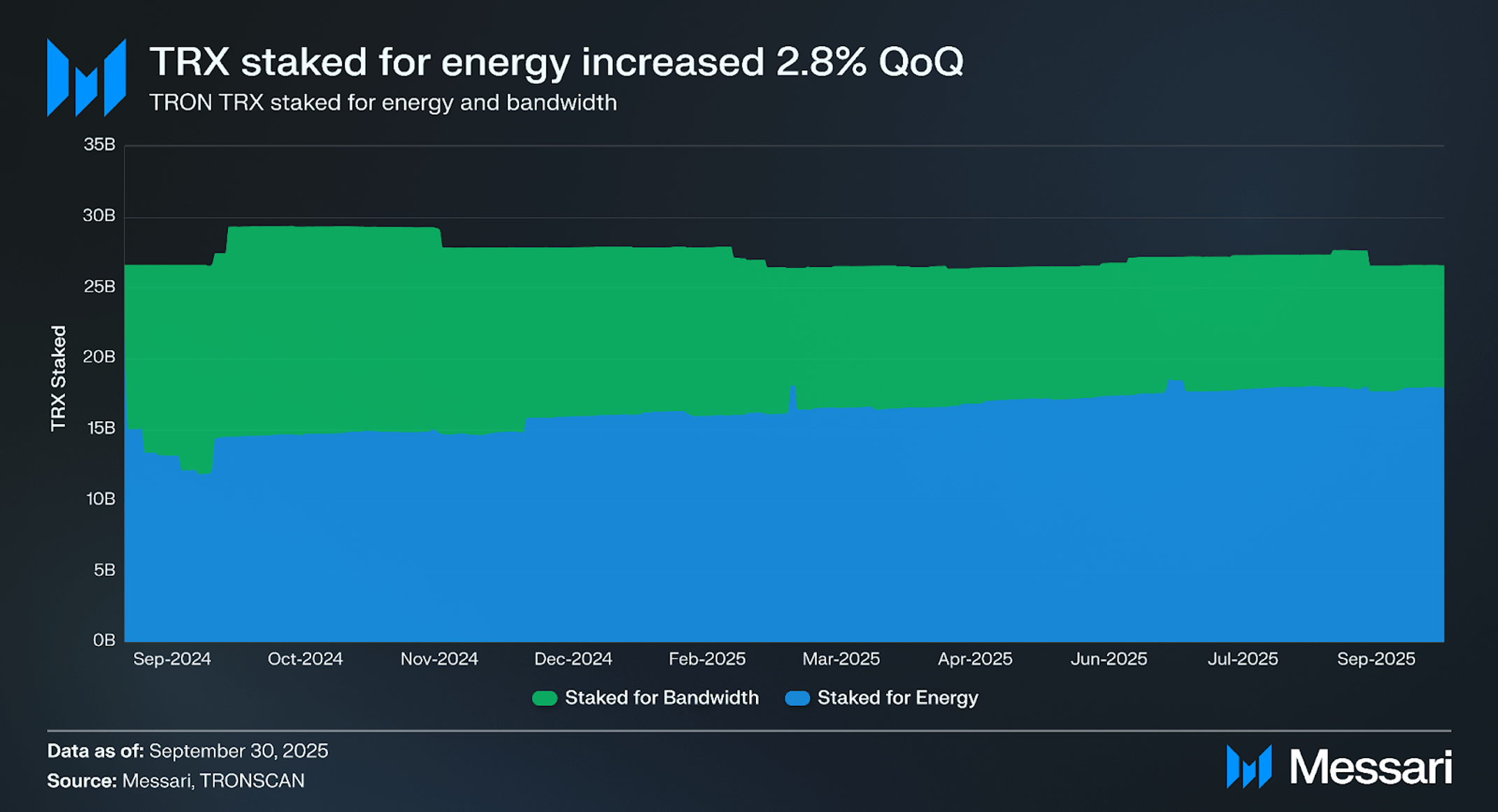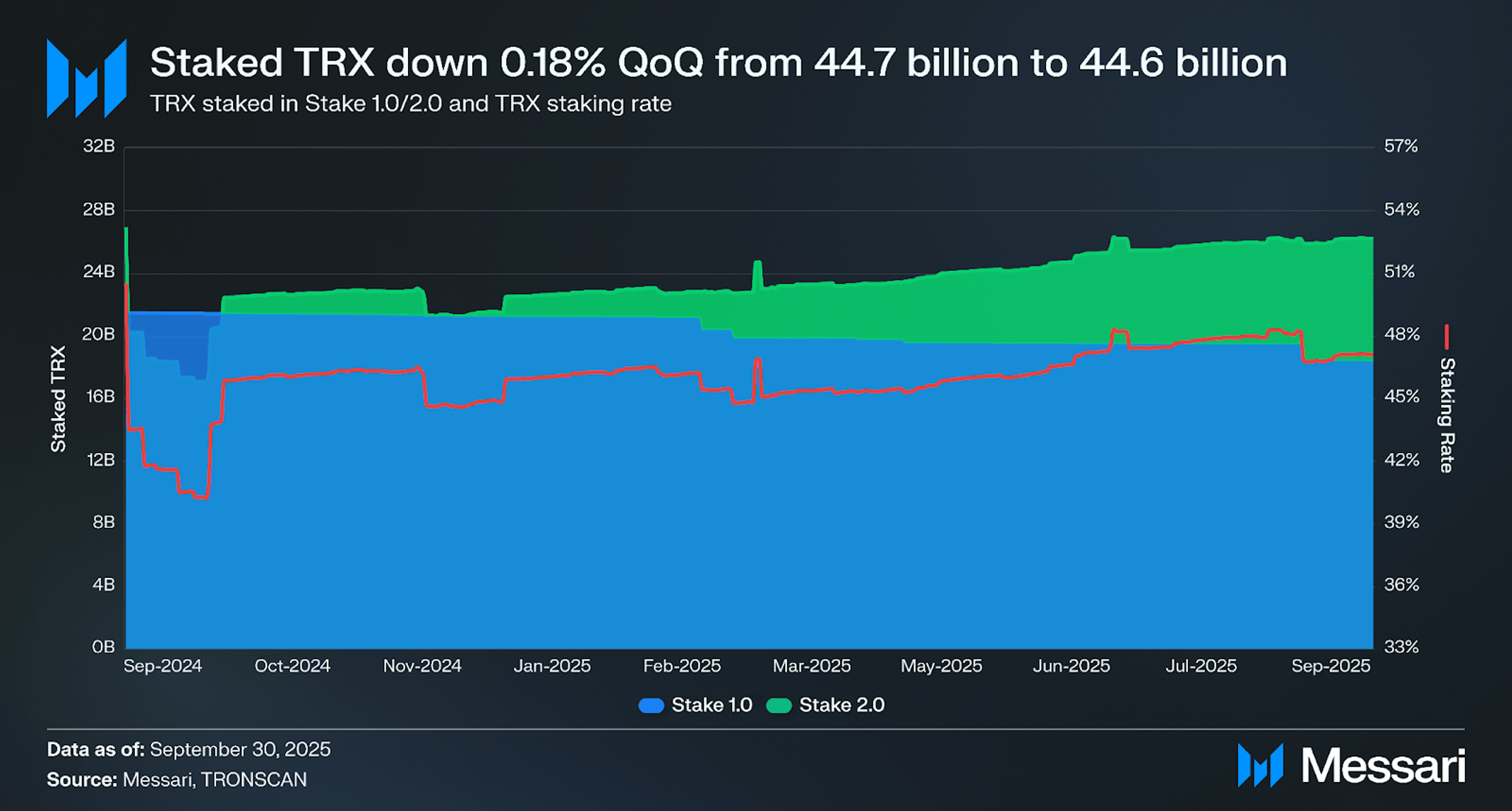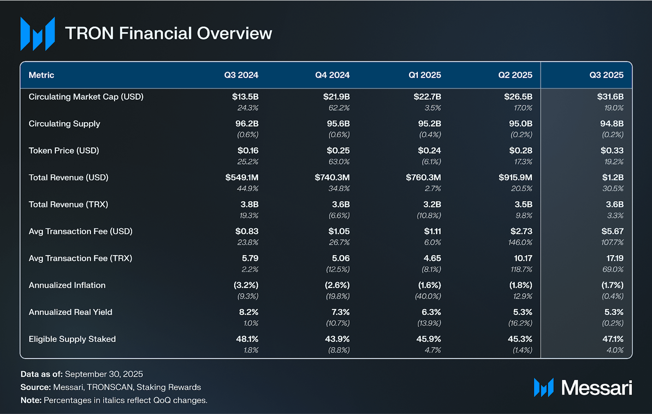 추정 연간 실질 스테이킹 수익률은 3분기에 5.27%에서 5.26%로 소폭 감소했으며, 이는 낮은 TRX 소각량의 결과로 전분기 대비 0.2% 하락했다.