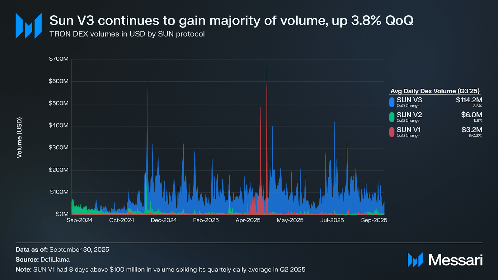 기본적으로 트론의 모든 탈중앙화거래소 거래량은 SUN에서 발생한다. 2023년 6월, SUN은 제품군에 집중 유동성(CL) AMM을 도입했다(선스왑 V3(SunSwap V3)). 2024년 1분기는 선스왑 V3 도입 이후 처음으로 SUN의 거래량 대부분이 V3 AMM을 통해 라우팅된 분기였다. SUN V3는 2025년 3분기 트론의 전체 거래량 중 92.6%를 차지했다.