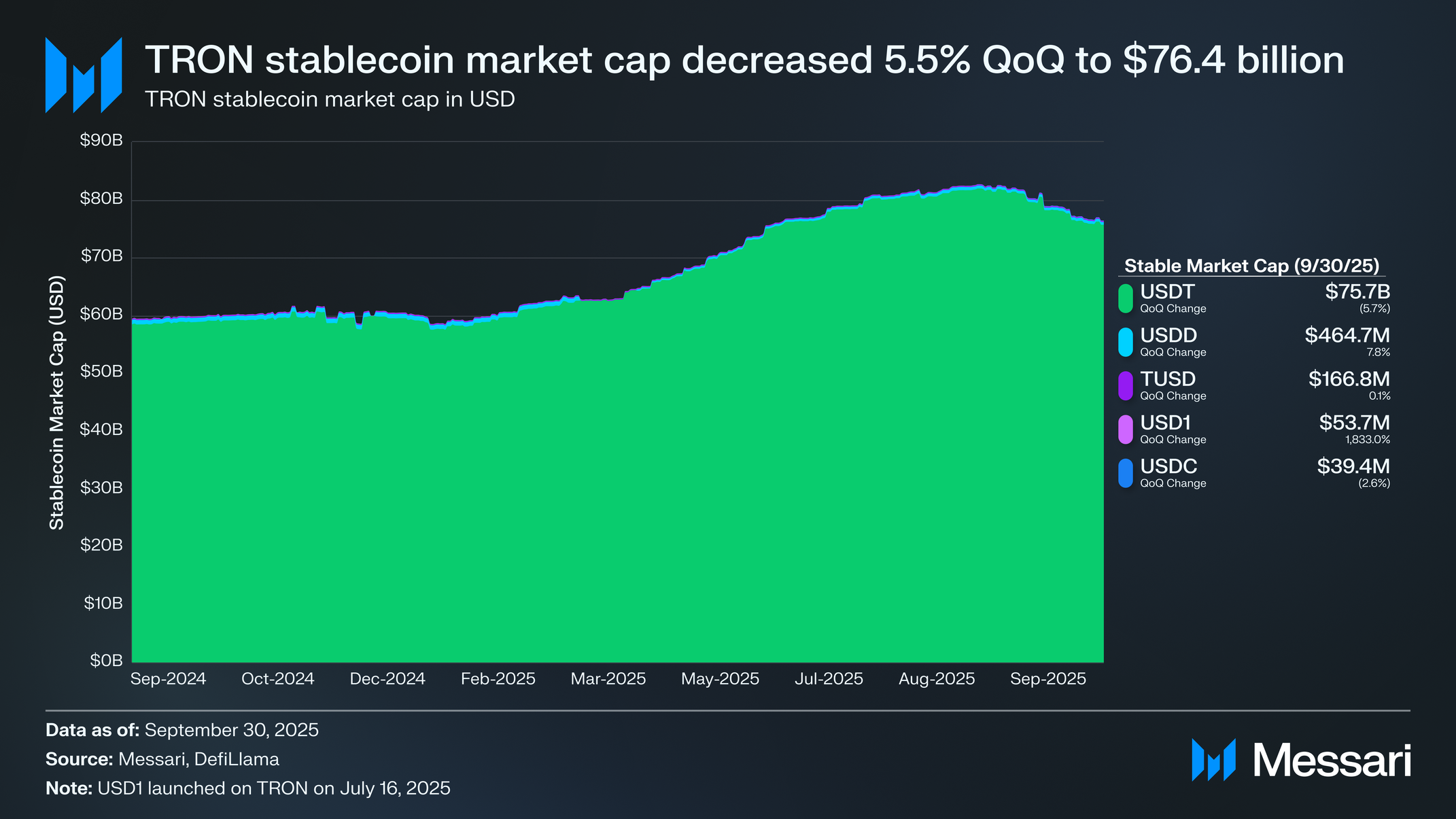 트론의 스테이블코인 시가총액은 지난 1년 동안 꾸준히 상승 추세를 보였지만 3분기에는 냉각되어 전분기 대비 5.5% 감소한 809억 달러에서 764억 달러가 되었다. 감소는 주로 USDT의 5.7% 하락에 의해 주도되었으며, USDT는 757억 달러의 시가총액으로 압도적 우위를 유지하여 트론 스테이블코인 공급의 99.1%를 차지한다. 특히 유통 중인 모든 USDT의 42.7%가 트론에 있다.