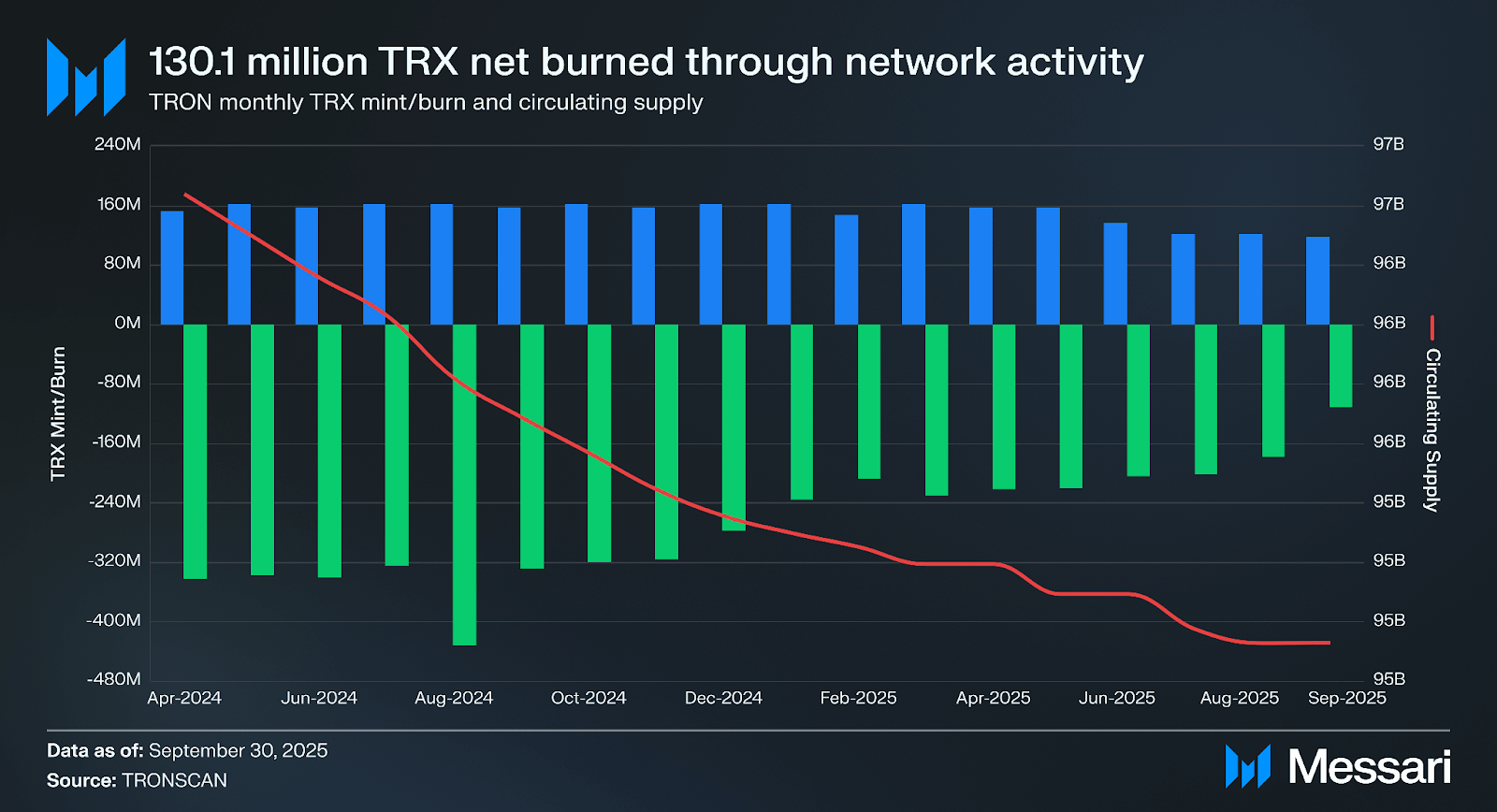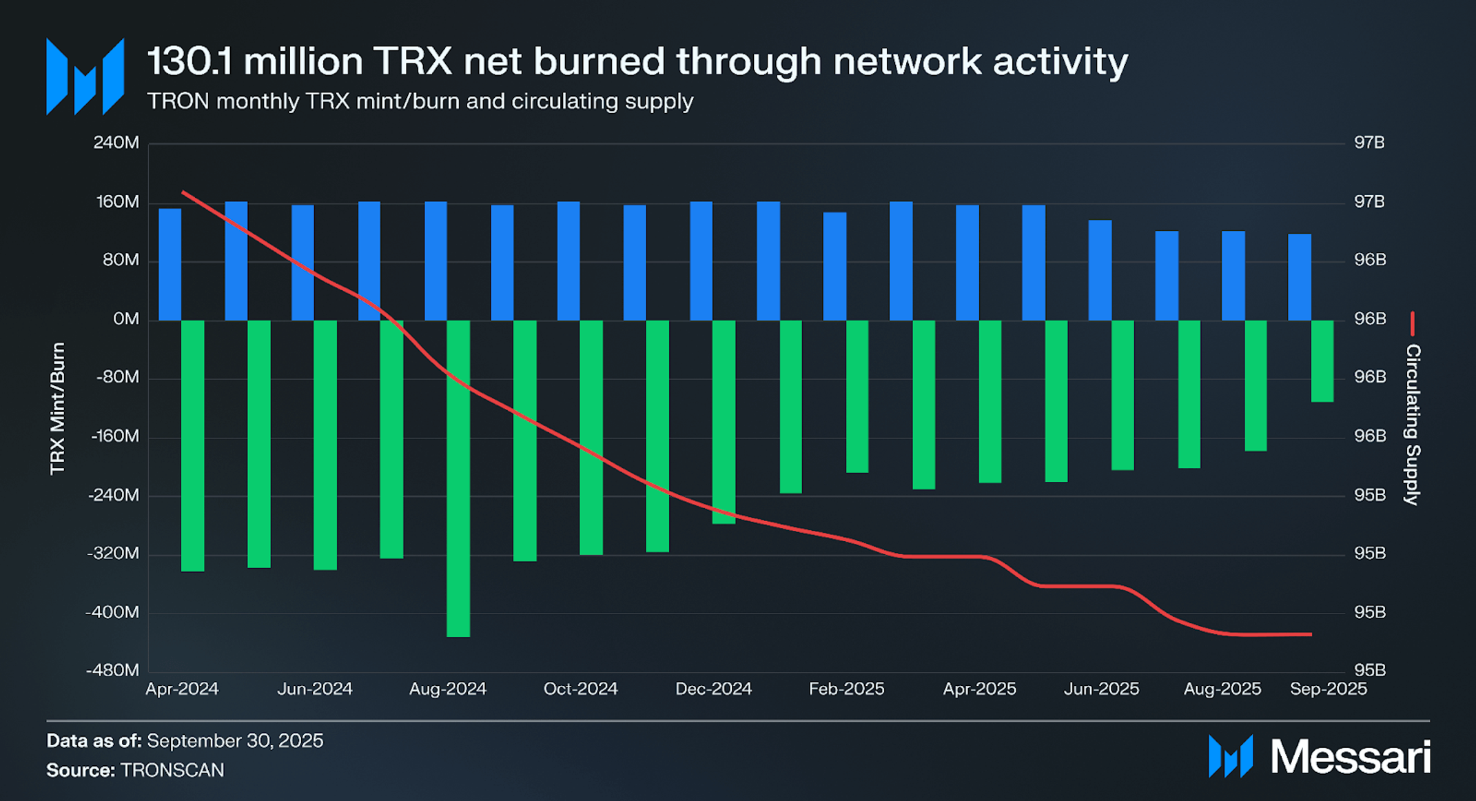TRX의 유통 공급은 주로 두 가지 매개변수의 영향을 받는다: (i) 스테이커와 블록 생성자에게 보상하기 위해 발행된 토큰, (ii) 네트워크 거래 수수료로 인해 소각된 토큰. 약 510만 TRX가 슈퍼 대표 및 스테이커에게 분배되는 블록 및 투표 보상으로 매일 발행된다. 따라서 평균적으로 매일 510만 TRX 이상이 소각되면 유통 토큰 공급이 시간이 지남에 따라 감소할 것이다.