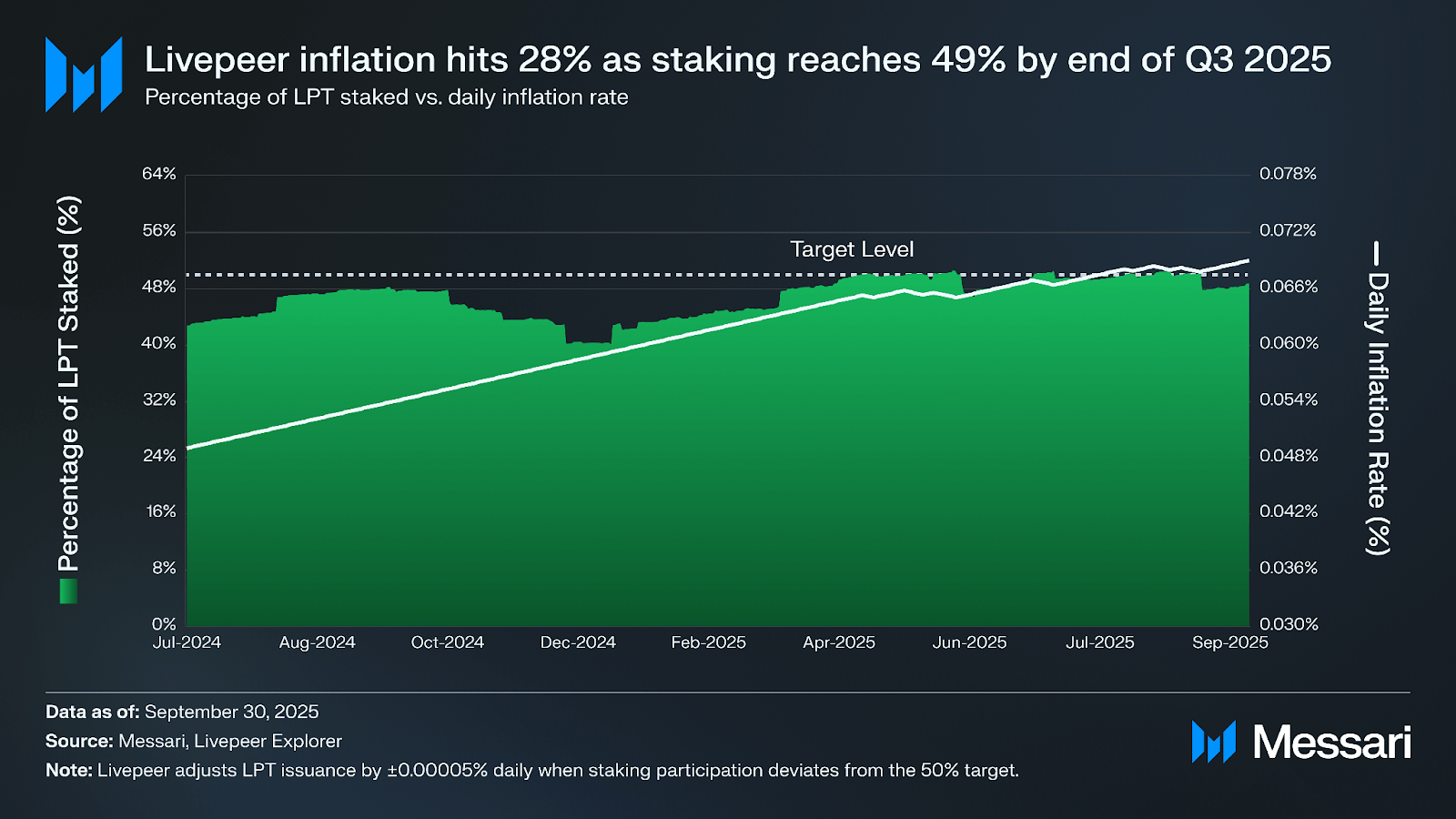 스테이킹 참여율은 2025년 2분기 50.1%에서 3분기 48.7%로 소폭 하락했다(–1.4%포인트). 라이브피어의 50% 목표 임계값 바로 아래로 떨어졌다. 프로토콜의 동적 인플레이션 메커니즘에 따라 연간 일일 인플레이션은 약 27.0%에서 약 28.03%로 상승했다. 네트워크가 분기 대부분을 참여 목표 이하로 보냈기 때문이다. 이 시스템에서 발행량은 참여율이 50% 미만으로 떨어지면 증가하고 50%를 초과하면 감소한다.