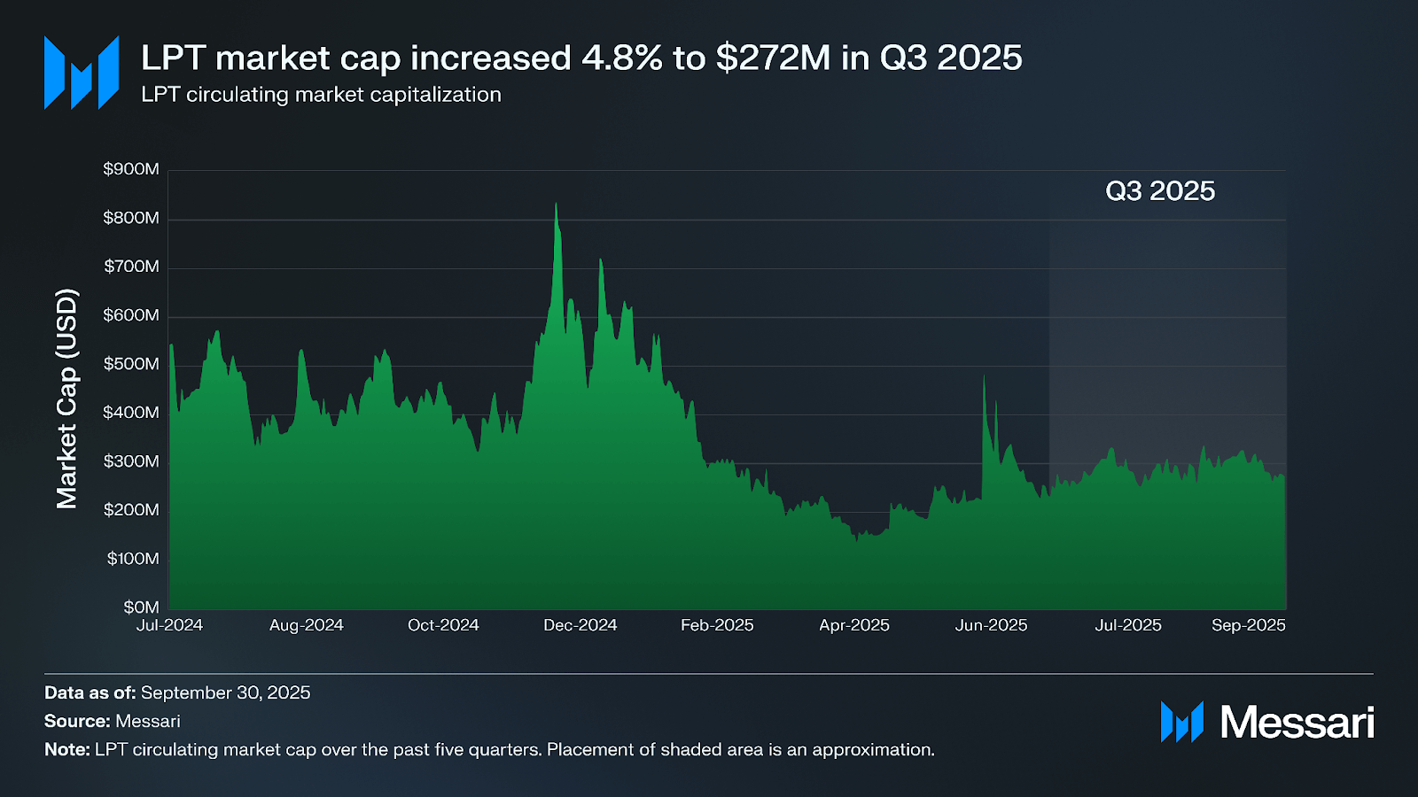 LPT의 유통 시가총액은 전 분기 대비 4.8% 상승해 2억 7,180만 달러를 기록했다(2억 5,950만 달러에서 증가). 토큰 가격이 2.3% 하락해 6.00달러가 됐음에도 불구하고(6.20달러에서 하락) 이러한 결과가 나타났다. 증가는 공급 확대에서 비롯됐으며, 유통 공급량은 약 4,190만에서 4,530만 LPT로 상승했다(340만, 전 분기 대비 8.2% 증가). 스테이킹 참여율이 50% 목표 이하로 유지되면서 지속적인 발행과 일치하는 유통 토큰의 이러한 성장은 완만한 가격 하락을 상쇄해 분기 동안 시가총액의 순증가를 가져왔다.