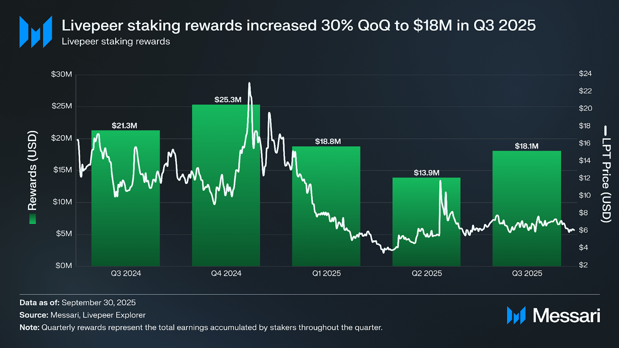 총 스테이킹 보상은 전 분기 대비 약 30% 증가해 약 1,810만 달러를 기록했다(2025년 2분기 1,390만 달러에서 증가). LPT 가격이 2.3% 하락(6.20달러에서 6.00달러)했음에도 불구하고 이러한 결과가 나타났다. 반등은 세 가지 상호 강화 요인에 의해 주도됐다.