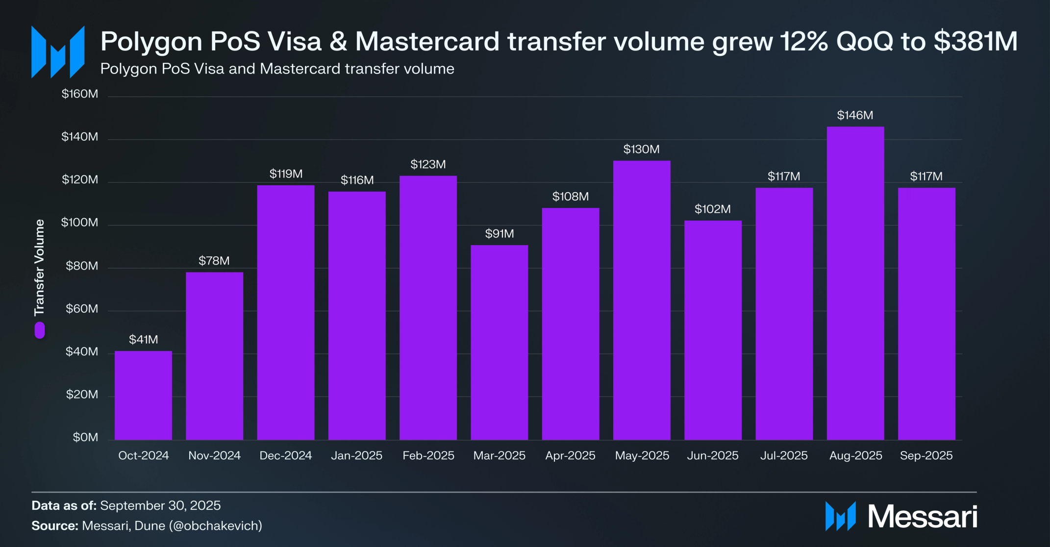 3분기 스테이블코인 연계 암호화폐 카드는 10개 다른 카드 프로그램에서 폴리곤 PoS에서 마스터카드와 비자를 합쳐 3억 8,080만 달러의 거래량을 처리했다. 마스터카드는 8,400만 달러, 비자는 2억 9,680만 달러를 차지했으며, 디지털 자산과 전통적인 결제 레일을 연결하는 지속적인 견인력을 반영한다. 결제 거래는 대규모 실제 암호화폐 채택의 가장 명확한 사례 중 하나를 강조한다. 3분기 결제 생태계의 발전은 다음을 포함한다.