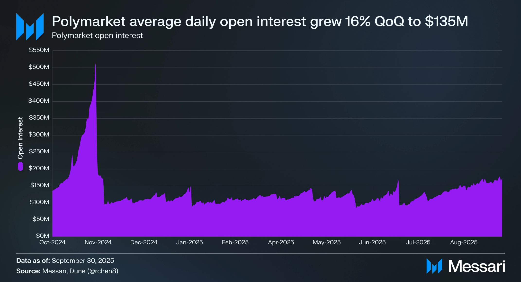 미국 대통령 선거를 전후한 2024년 4분기 피크에서 하락했음에도 불구하고, 폴리마켓은 최근 분기에 미결제약정을 유지했다. 폴리마켓은 3분기 평균 일일 미결제약정 1억 3,500만 달러를 기록했으며, 전 분기 대비 16.2% 증가했다.