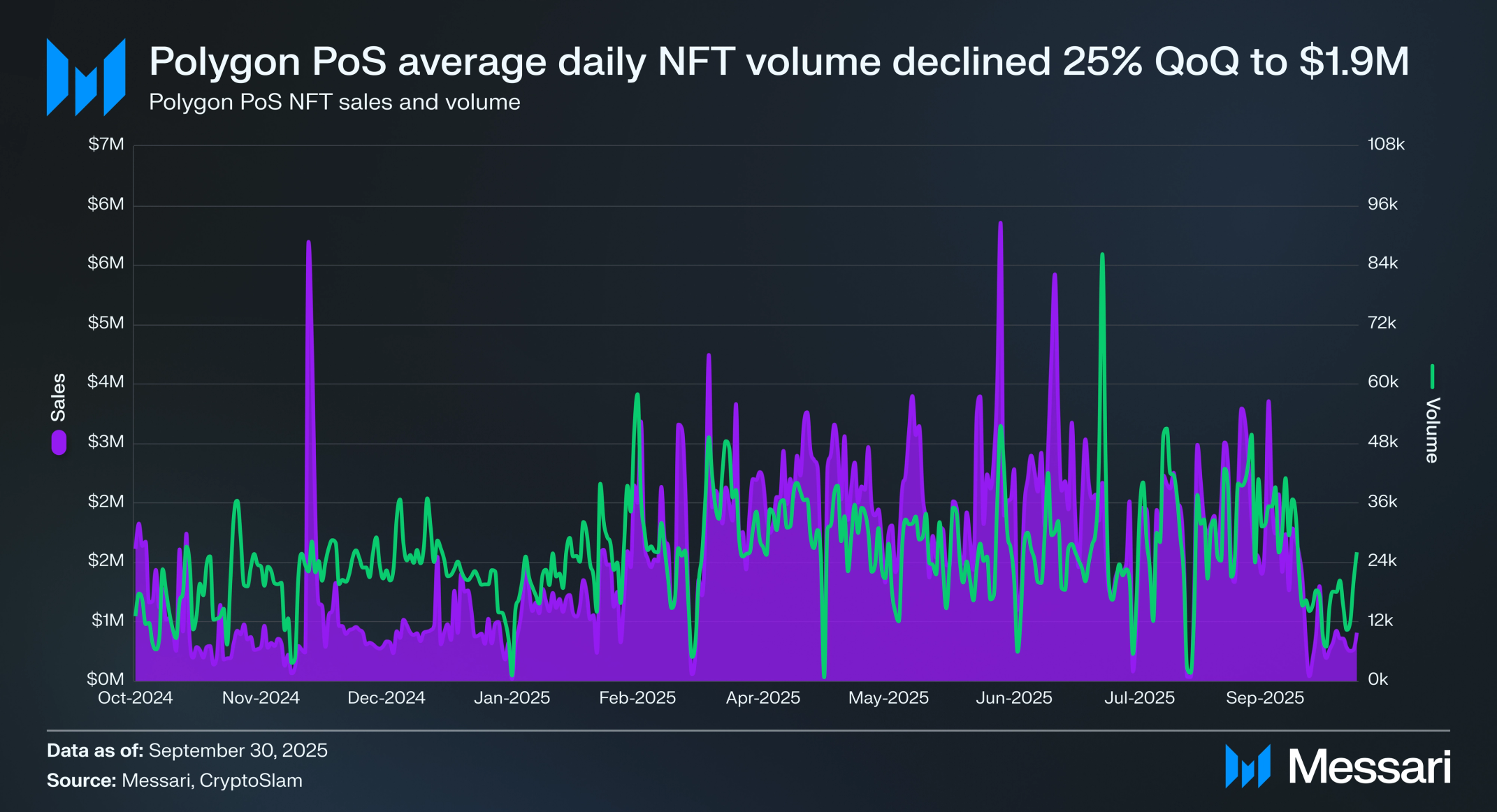 폴리곤 PoS는 2025년 3분기 동안 NFT 활동 감소를 경험했다. 평균 일일 NFT 거래량은 190만 달러로 하락했으며, 전 분기 대비 22.1% 감소를 나타냈다. 반대로 평균 일일 NFT 판매는 2만 7,400건으로 상승했으며, 전 분기 대비 2.3% 증가를 나타냈다. 분기 동안 NFT 활동은 주로 코트야드에 의해 주도됐으며, 1억 5,780만 달러의 판매를 기록했다(분기 총 NFT 거래량의 90.4%). 폴리곤은 2025년 7월 3일 일일 NFT 거래량 550만 달러의 분기 피크를 경험했으며, 코트야드의 포켓몬 NFT 수요가 이를 견인했다.