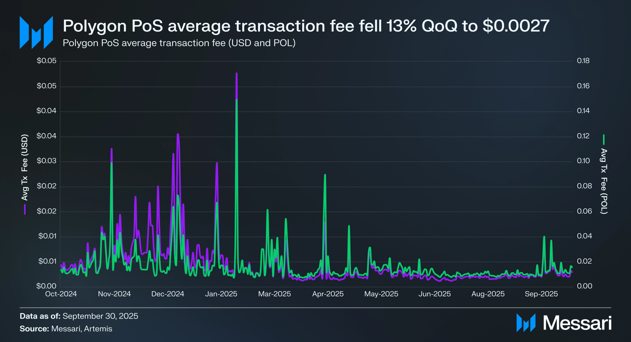최근 네트워크 업그레이드에 힘입어 폴리곤의 평균 거래 수수료는 계속 감소했으며, 사용자와 애플리케이션의 비용 효율성이 개선됐다. 평균 수수료는 전 분기 대비 23.6% 하락해 0.0114 POL을 기록했으며, 달러 표시 수수료는 12.8% 감소해 0.0027달러를 기록했다. 이러한 감소는 폴리곤의 처리량 및 가스 최적화의 영향을 반영하며, 결제 및 스테이블코인 전송과 같은 고빈도 활동의 경제성을 향상시킨다.