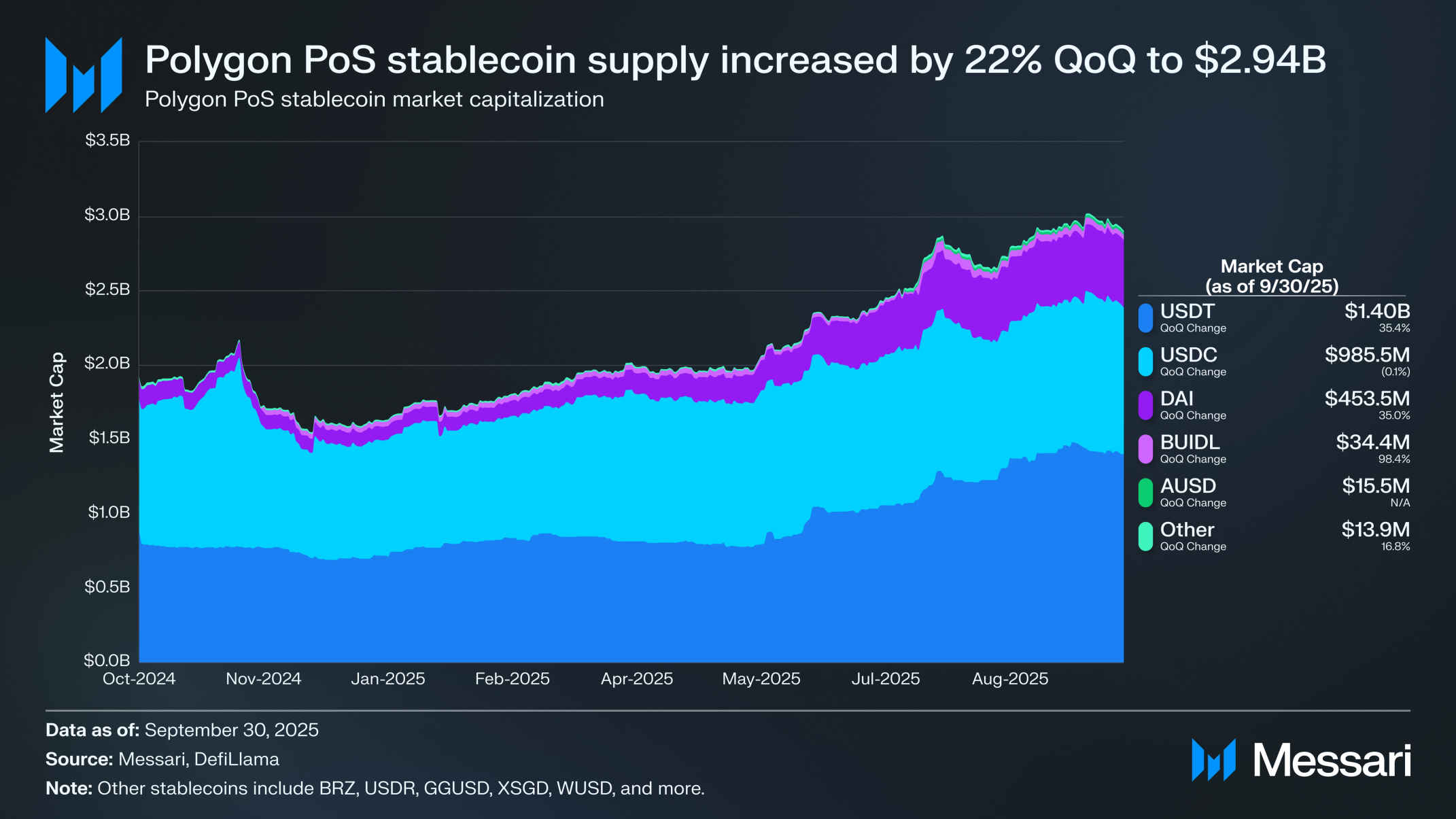 • 폴리곤 PoS 스테이블코인 공급량은 전 분기 대비 22.0% 증가해 29억 4,000만 달러를 기록했다. USDT가 전 분기 대비 35.4% 상승해 14억 달러에 도달하며 주도했다.