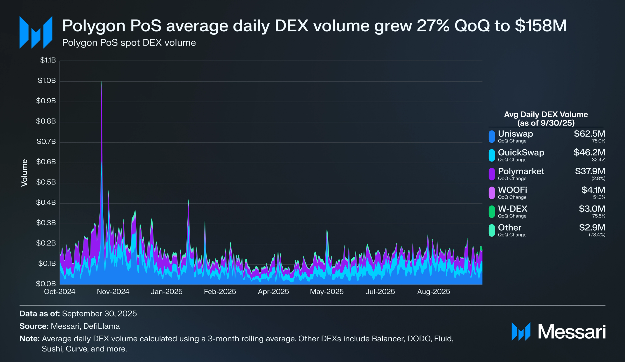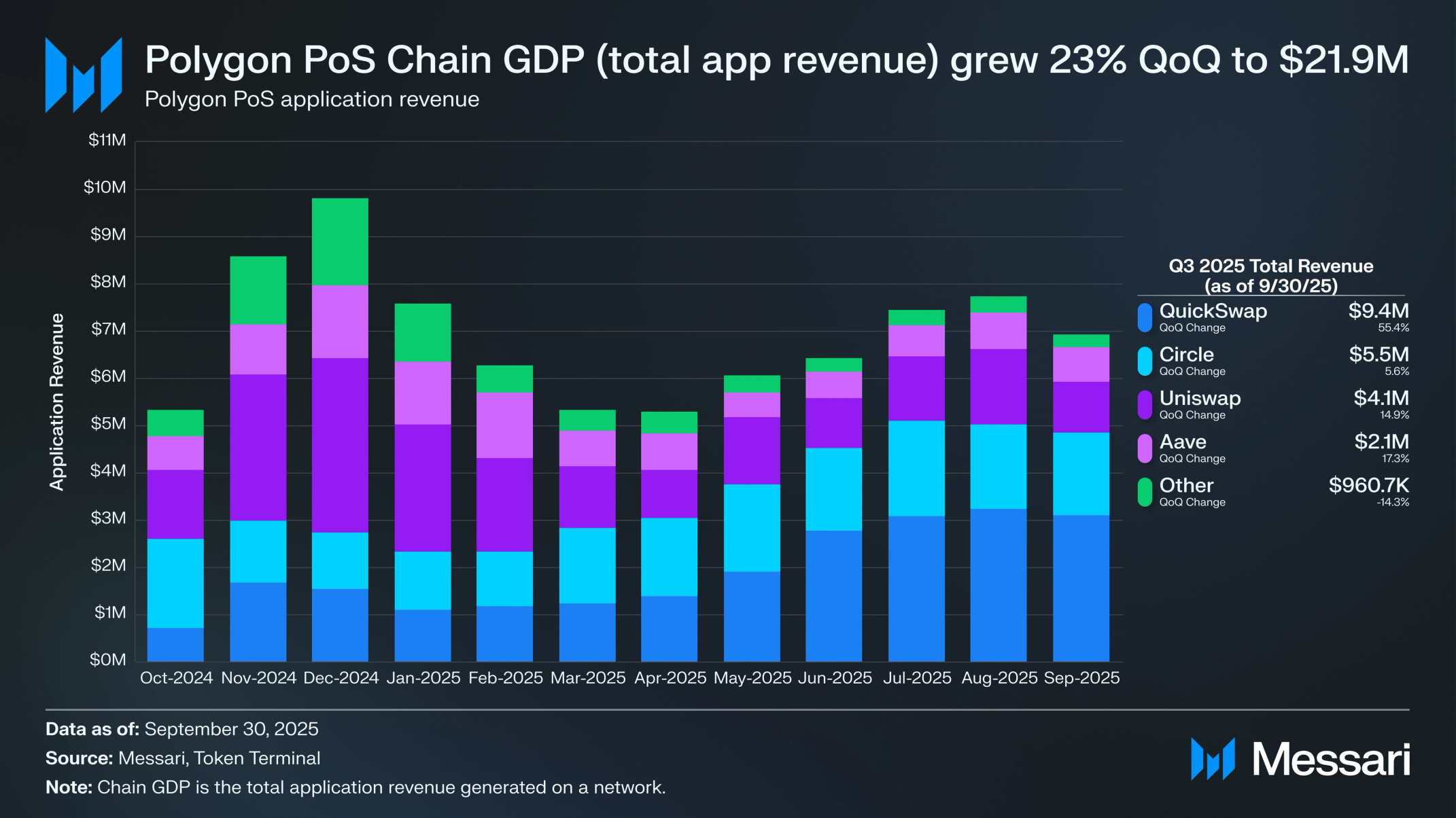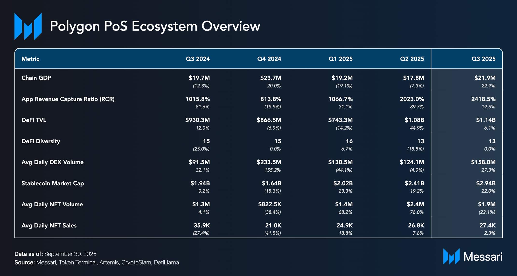 • 폴리곤 PoS(Polygon PoS) 디파이 TVL은 3분기 11억 4,000만 달러로 마감했으며, 퀵스왑(QuickSwap)과 폴리마켓(Polymarket)은 각각 전 분기 대비 15.1%와 29.8% TVL 증가를 기록했다.