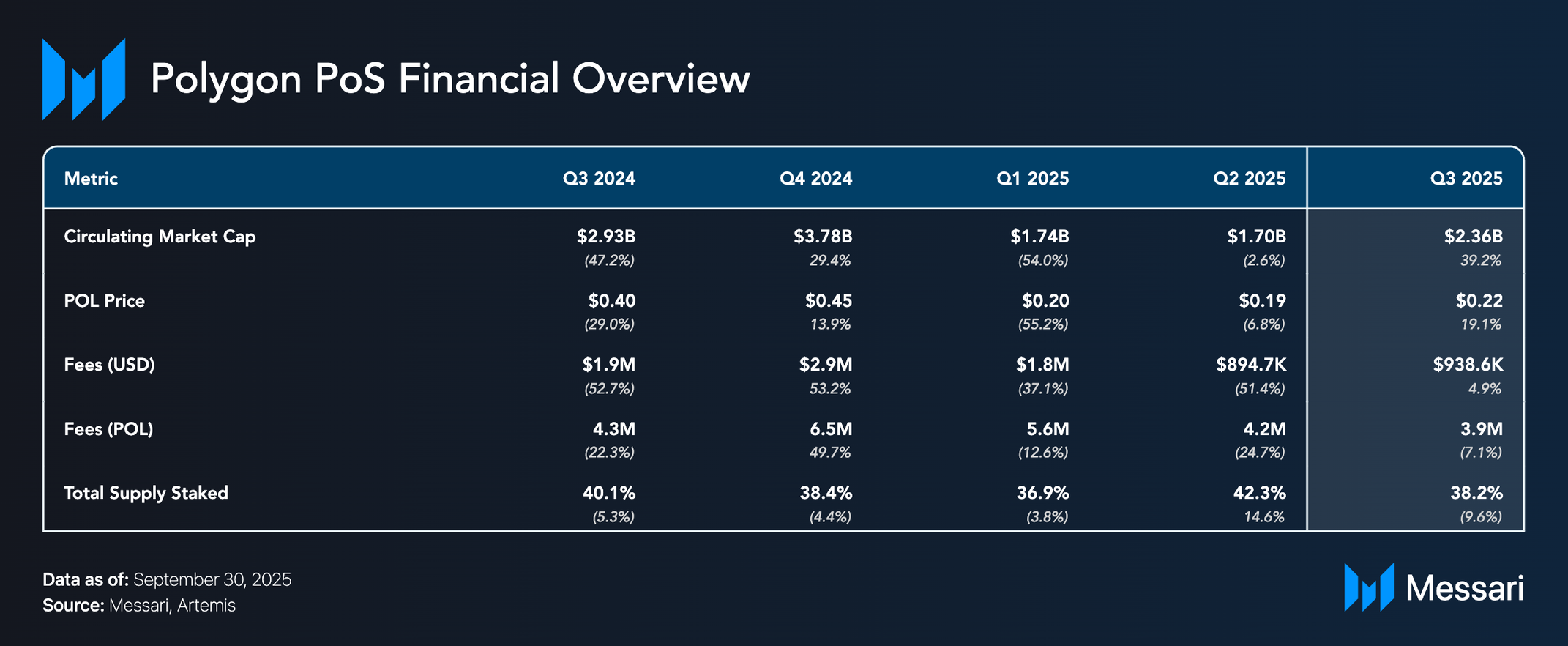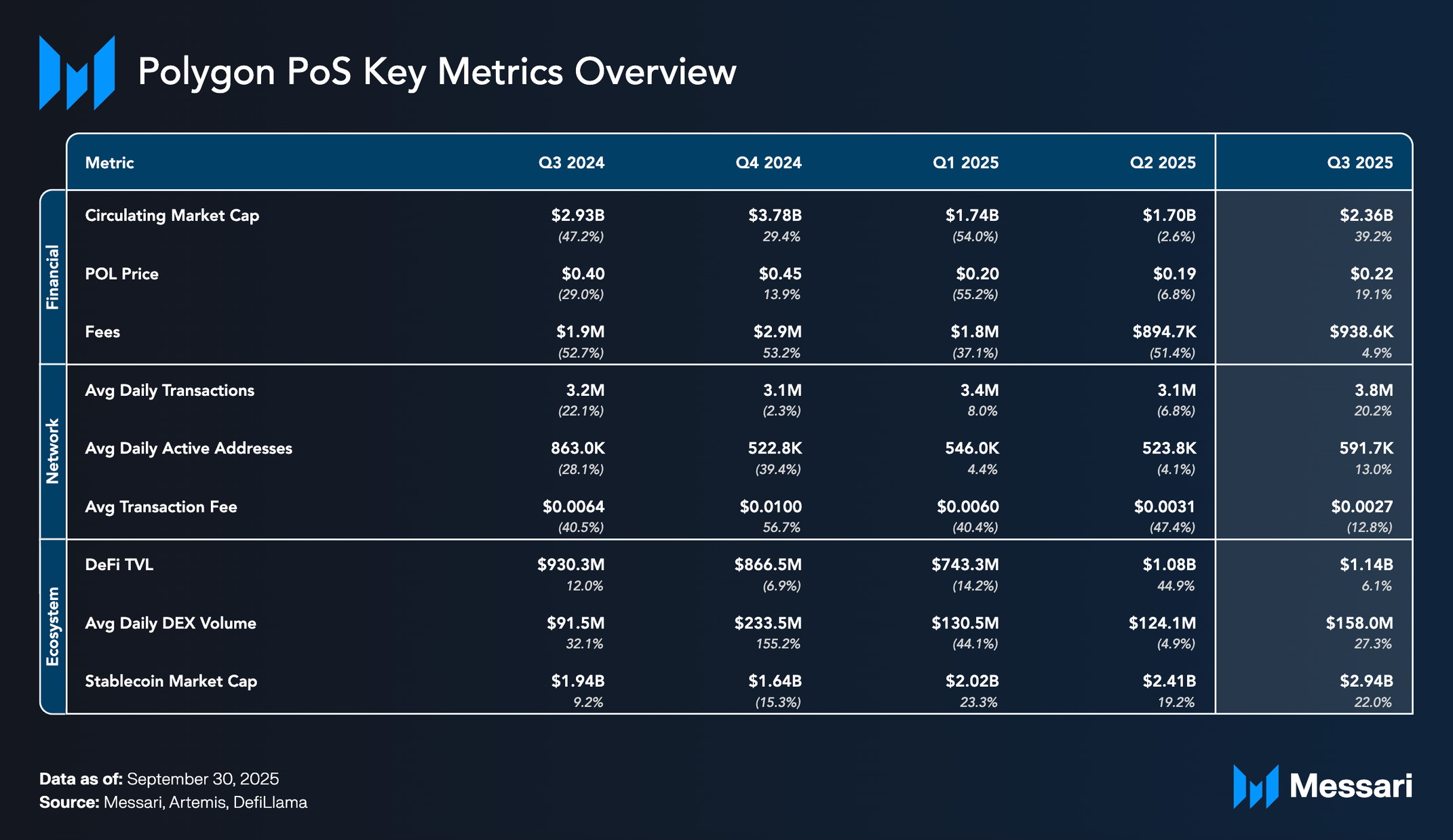• POL의 유통 시가총액은 전 분기 대비 39.2% 증가해 23억 6,000만 달러를 기록했으며, 같은 기간 20.7% 상승한 더 넓은 암호화폐 시장을 능가했다.