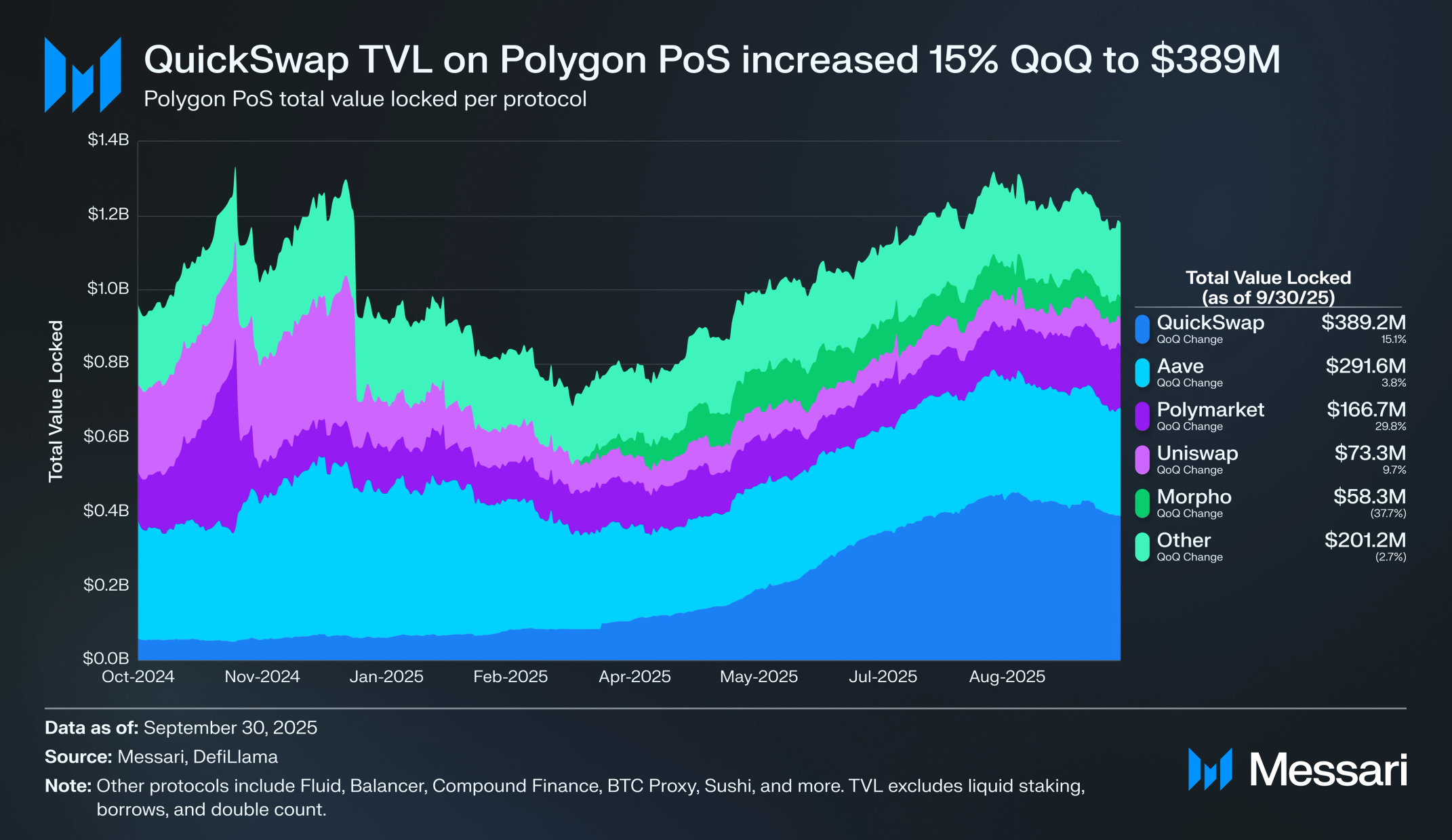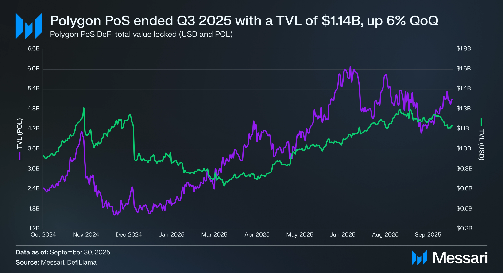 폴리곤 PoS 디파이 총 예치 가치(TVL)는 2025년 3분기 11억 4,000만 달러로 마감했으며, 전 분기 대비 6.1% 증가했다. 폴리곤은 TVL 기준 11번째로 큰 네트워크에서 13번째로 하락했다.