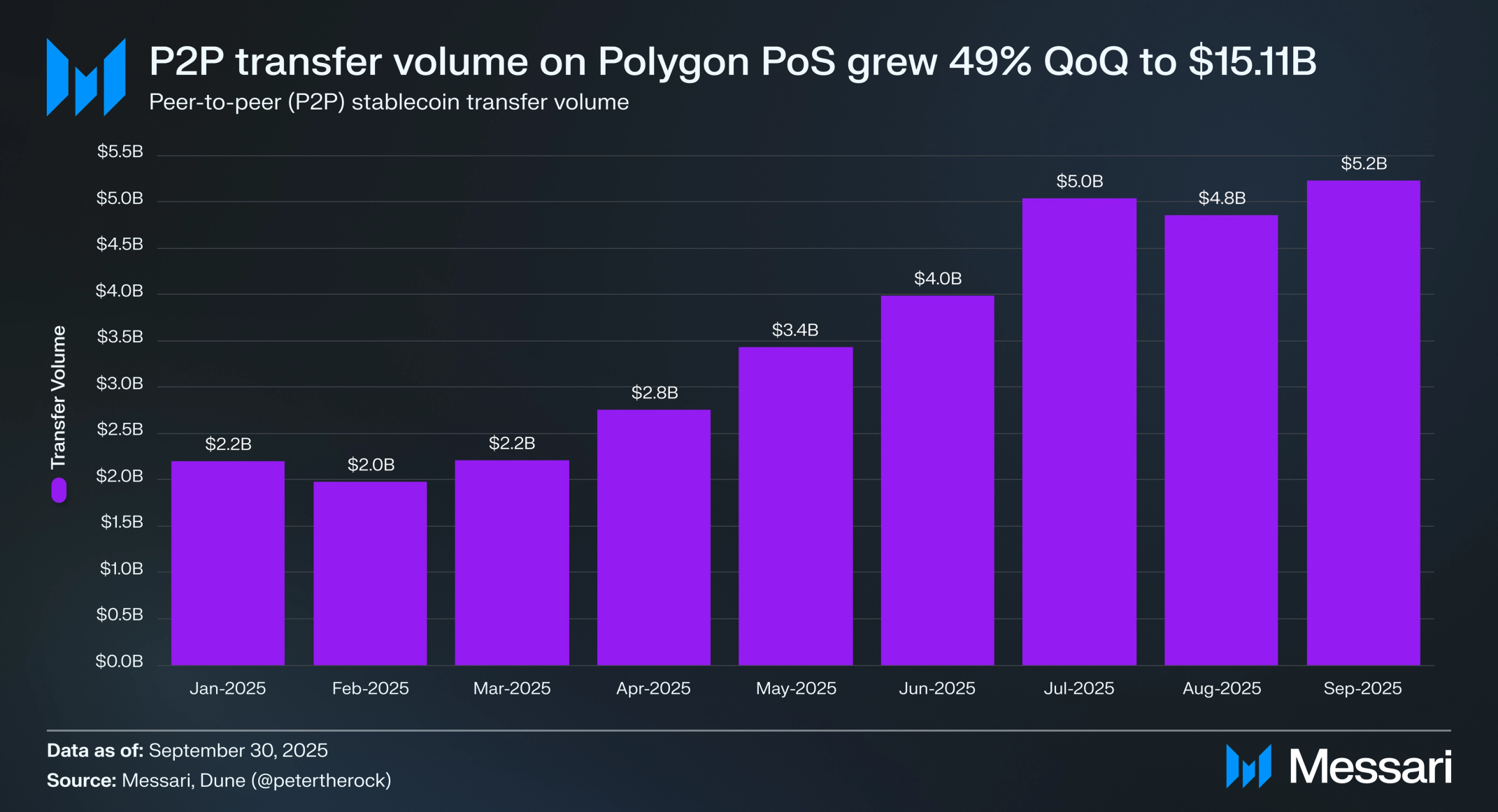 폴리곤 PoS의 P2P 스테이블코인 전송은 3분기 총 151억 1,000만 달러를 기록했으며, 2분기 101억 8,000만 달러에서 48.5% 증가했다. 거래량은 2025년 초 이후 두 배 이상 증가했으며, 지갑 간 결제의 강력하고 지속적인 채택을 반영한다. 성장은 저비용, 고빈도 스테이블코인 거래에 대한 지속적인 수요를 강조하며, 일상적인 온체인 결제를 위한 선도 네트워크로서 폴리곤의 위치를 강화한다.