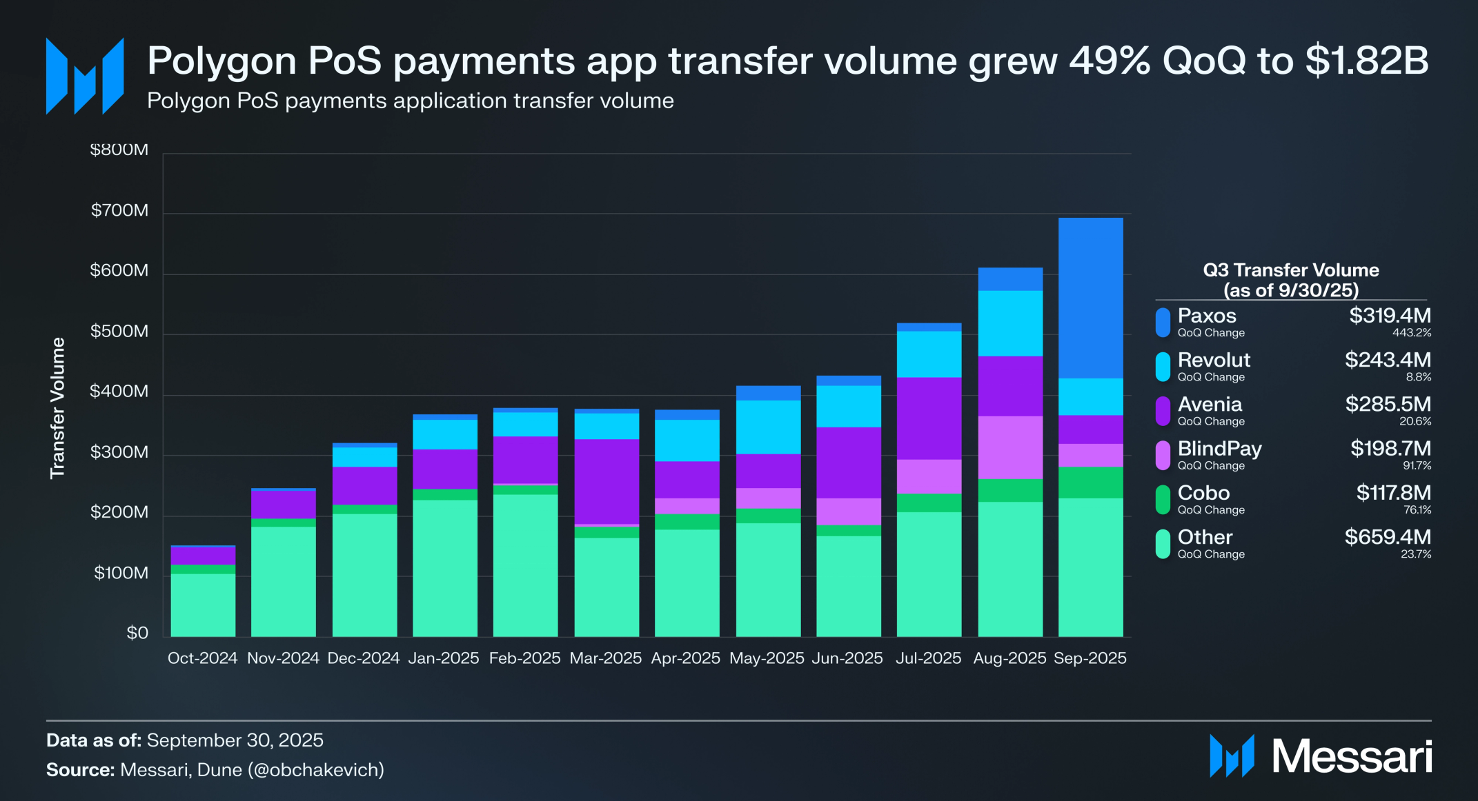 폴리곤은 낮은 수수료, 빠른 결제, 접근 가능한 개발 환경을 제공하며 결제 솔루션의 자연스러운 본거지로 자리 잡았다. 3분기 폴리곤 PoS의 결제 중심 애플리케이션은 50개 이상의 플랫폼에서 18억 2,000만 달러의 전송 거래량을 처리했으며, 전 분기 대비 49.2% 증가했다.