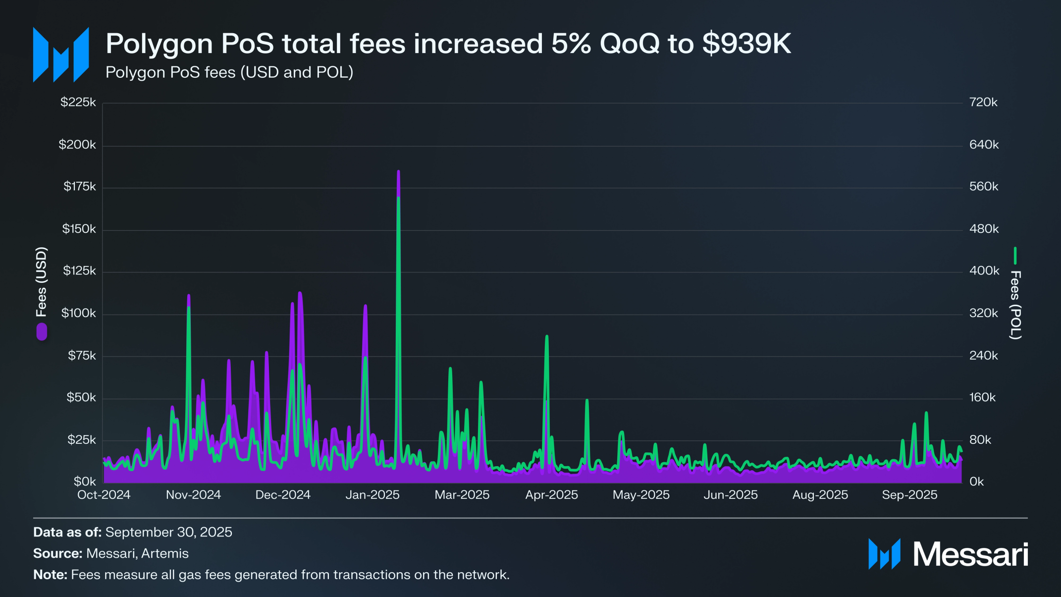 2024년 1분기 EIP-4844가 폴리곤 PoS 메인넷에서 제정돼 블롭(blob)을 도입하고 폴리곤 비용 구조를 크게 변경했다. EIP-4844와 블롭은 L1에 대한 게시 비용을 저렴하게 만들어 사용자의 평균 거래 수수료를 낮춘다. 2025년 3분기 총 거래 수수료(POL)는 전 분기 대비 7.1% 감소해 390만을 기록했으며, 총 거래 수수료(USD)는 4.9% 상승해 93만 8,600달러를 기록했다.