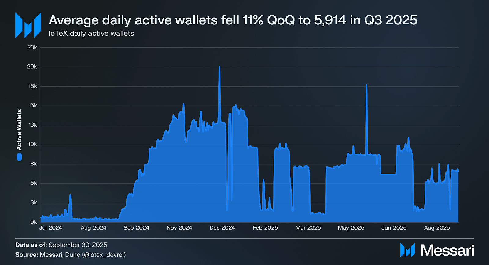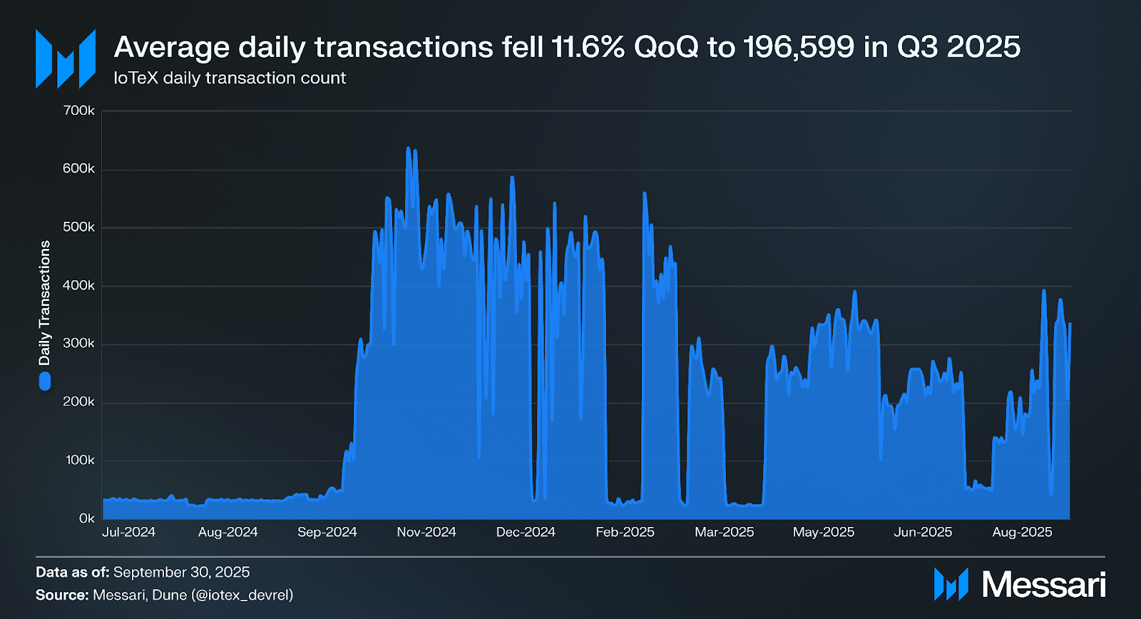 IoTeX L1의 평균 일일 활성 지갑은 2025년 3분기 전 분기 대비 10.8% 감소해 5,914개를 기록했으며, 평균 일일 거래의 하락을 반영했다. 두 지표 모두 올해 초 상승한 활동 수준 이후 최근 몇 달 동안 네트워크 사용량이 완화됐음을 시사한다.