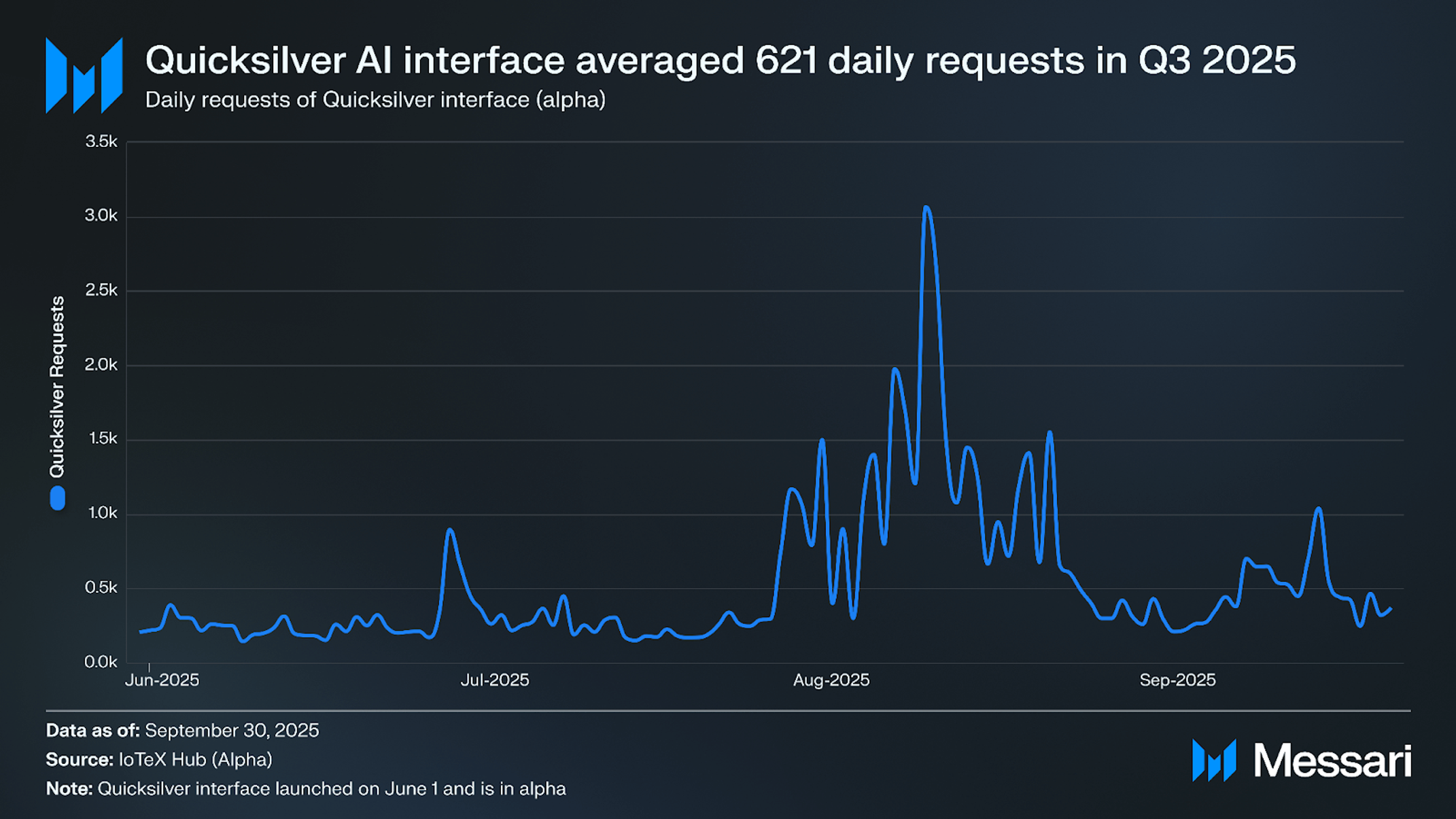 • 2025년 3분기 IoTeX는 평균 일일 퀵실버(Quicksilver) 에이전트 요청 621건을 기록했으며, 6월 활동의 두 배 이상을 기록했다. 사용량은 8월 중순 일일 3,000건 이상의 쿼리로 정점을 찍은 후 9월에 정상화됐으며, 개발자 실험 증가와 더 넓은 사용자 접근을 반영했다.